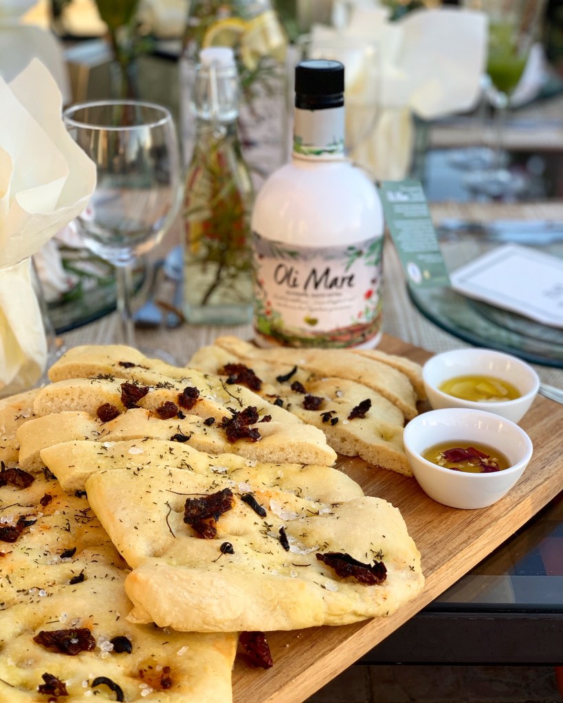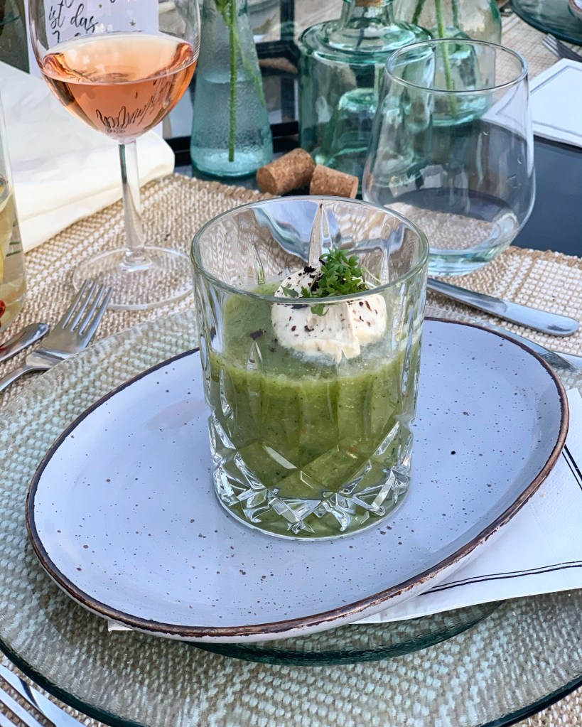 Zum nächsten Gang gab es ein Zucchini-Gazpacho mit einer mit Kaffeesalz aromatisierten Sahnehaube. Als Beilage dazu Focaccia, welches natürlich auch selbst gebacken war.