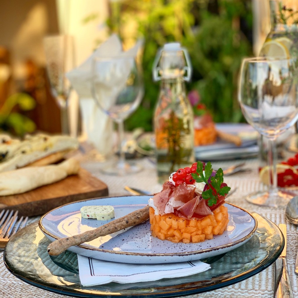 Als Vorspeise gab es eigentlich nichts anderes als Prosciutto Melone. Allerdings mit folgende Besonderheit… und jetzt kommt einer von Thoms persönlichen Tipps: Ich habe hier die Melone klein geschnitten, leicht mariniert und als Tatar geformt und dann den Prosciutto darauf gesetzt. Das Ganze wurde mit Ribiseln abgerundet und verfeinert – die geben etwas Säure – und Creme fraiche, alles mit Grissini serviert.