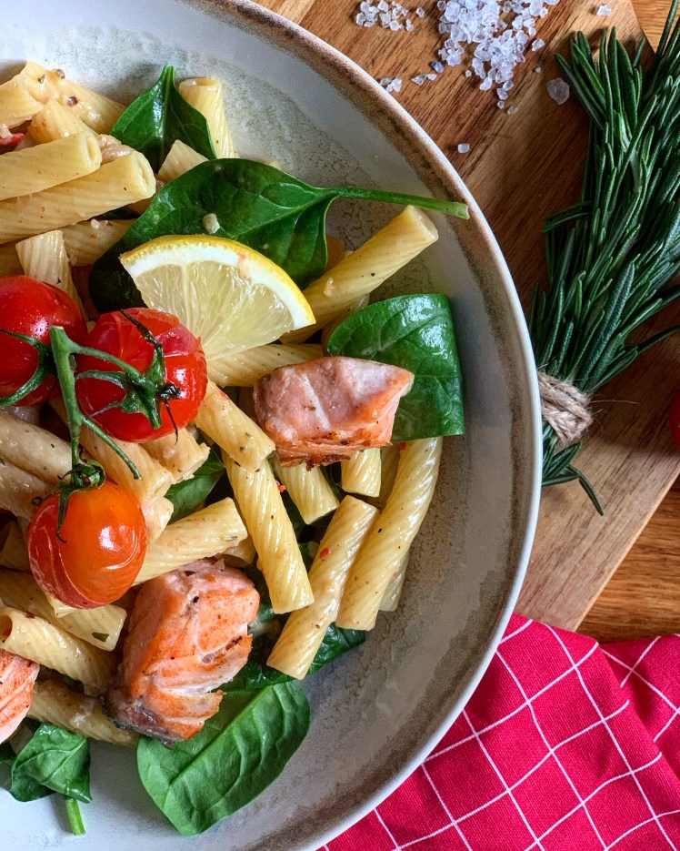 Für dieses Rezept habe ich eine Zutat verwendet, die man eher im Cocktailglas als am Teller finden würde: GIN. Kombiniert mit spritziger Zitrone, saftigem Lachs und frischem Babyspinat passen sich diese Zutaten perfekt der Makkaroni an und ergeben einen rundum leckeren Geschmack. Die geschmolzenen Tomaten geben dem Gericht die nötige Süsse und Farbe.