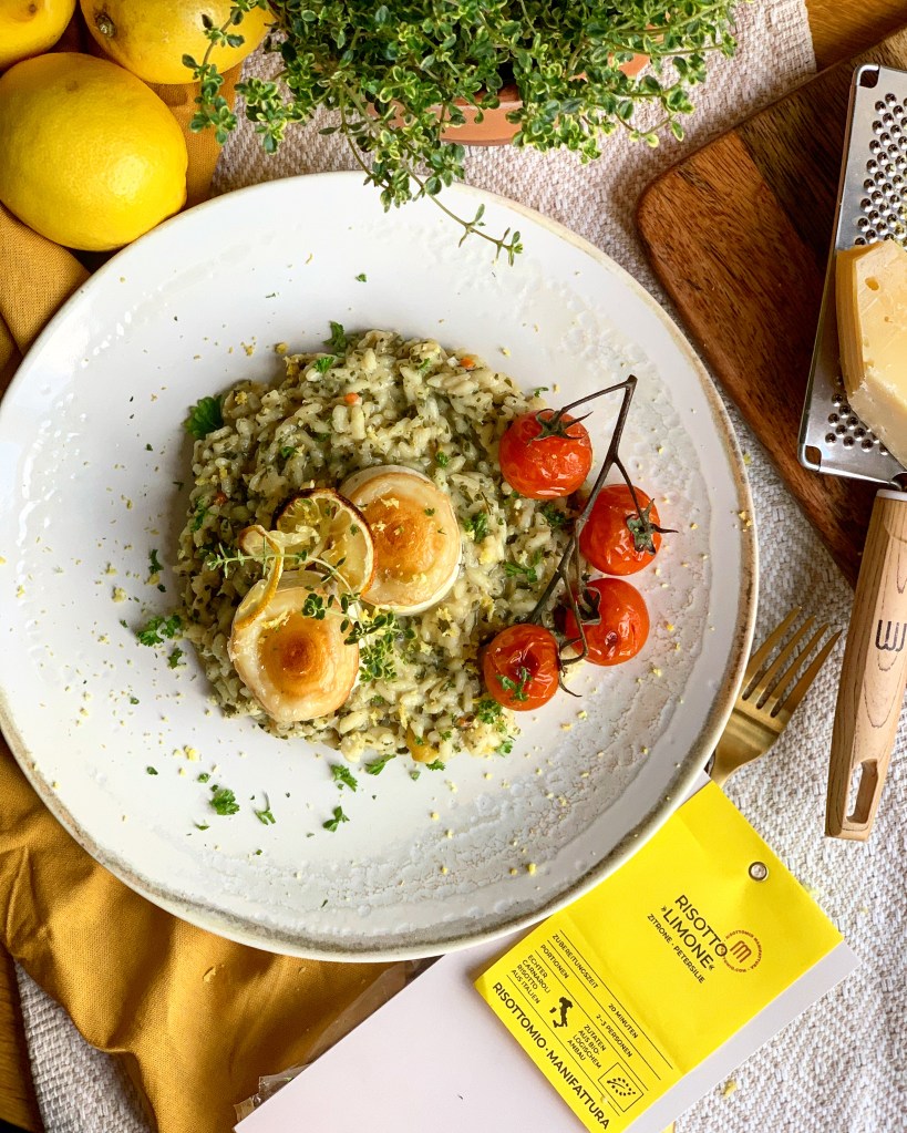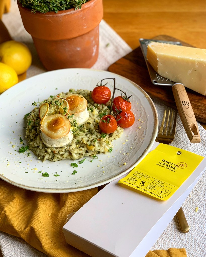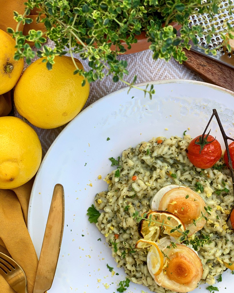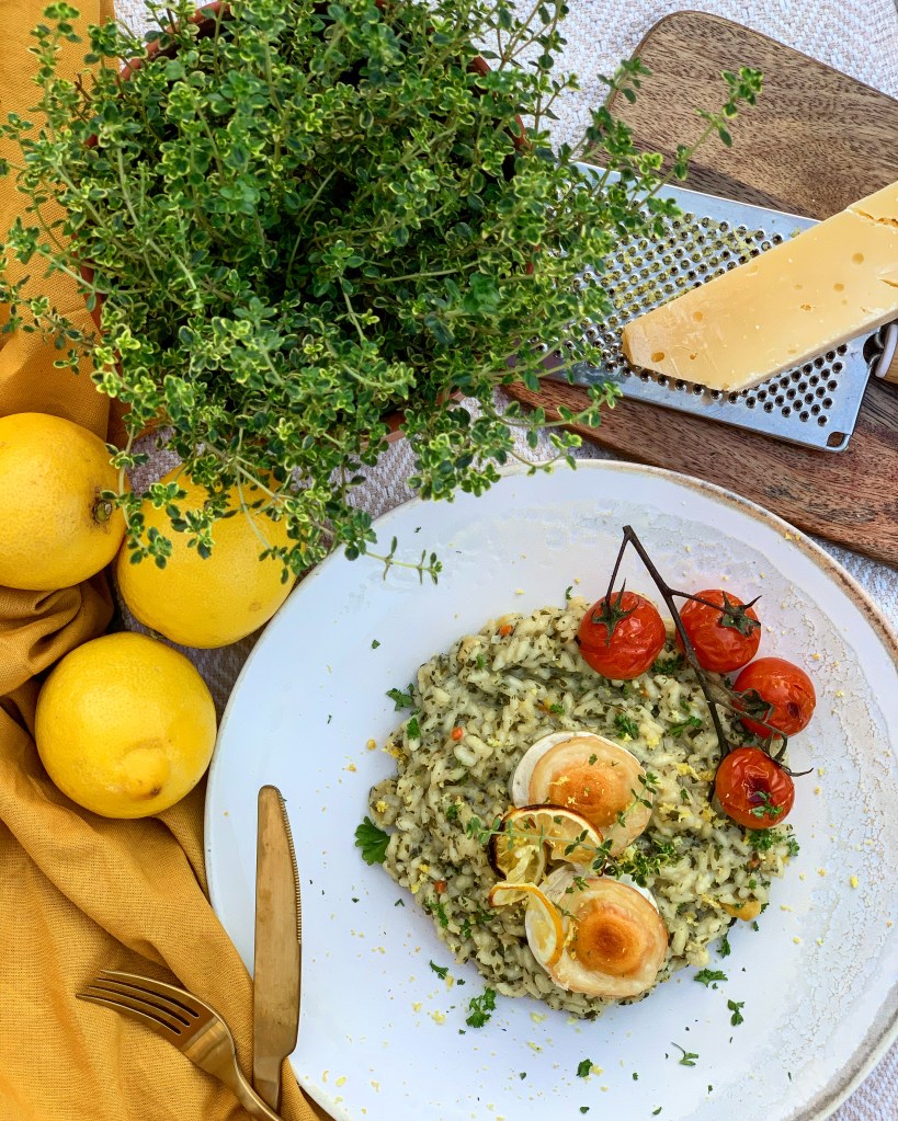 Das Risotto *Limone* könnt ihr pur genießen oder, so wie ich, mit etwas gegrilltem Ziegenkäse und geschmolzenen Tomaten verfeinern.