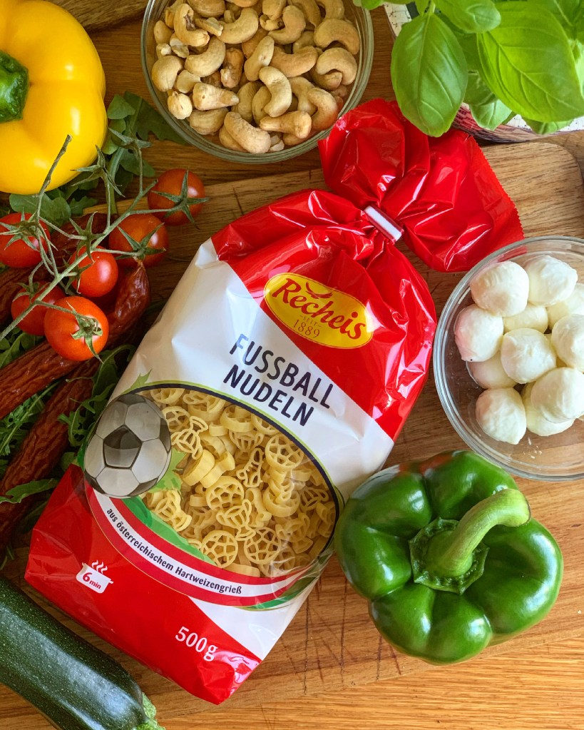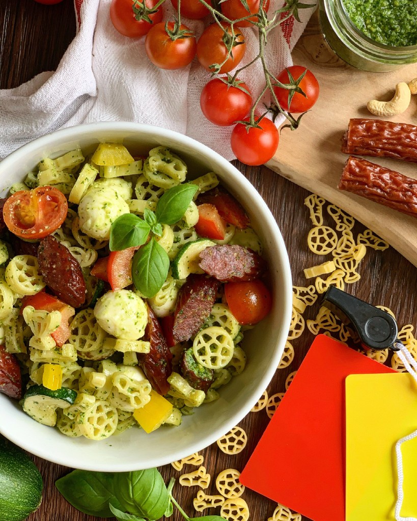 Die Zutatenliste ist überschaubar und der Nudelsalat schnell zubereitet. Ich habe ein Pesto mit Cashewkernen dazu gemacht und ein wenig „grün“ ins Spiel zu bringen. Kleine Mozzarellabällchen sollen Fussbälle darstellen, Tomaten und Paprika rote und gelbe Karten. Ich würd sagen – ANPFIFF!