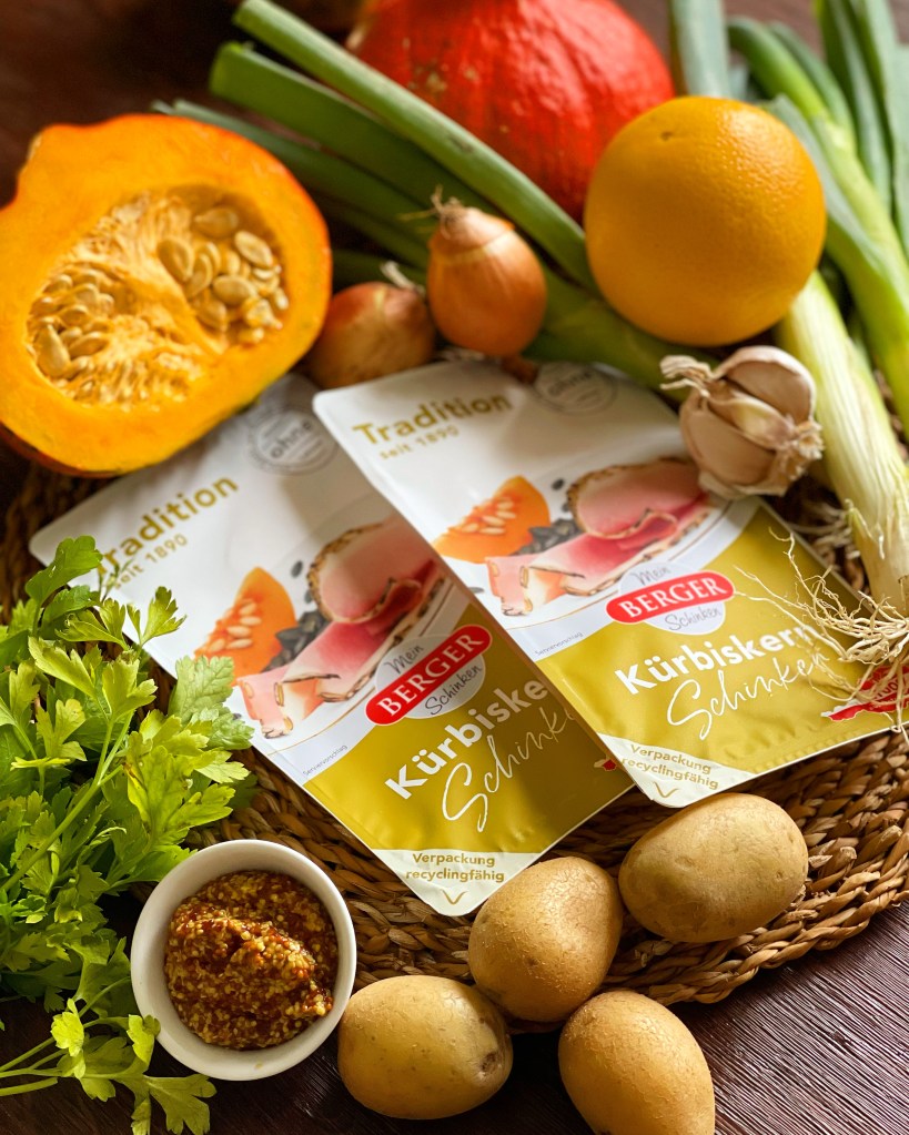 Berger Schinken hat sich auch dem Kürbis angenommen und eine herbstliche Kreation mit Kürbiskernen gemacht, den Kürbiskern-Schinken. Ummantelt mit vitaminreichen Kürbiskernen ist diese Variation in jeder Hinsicht sehr interessant.