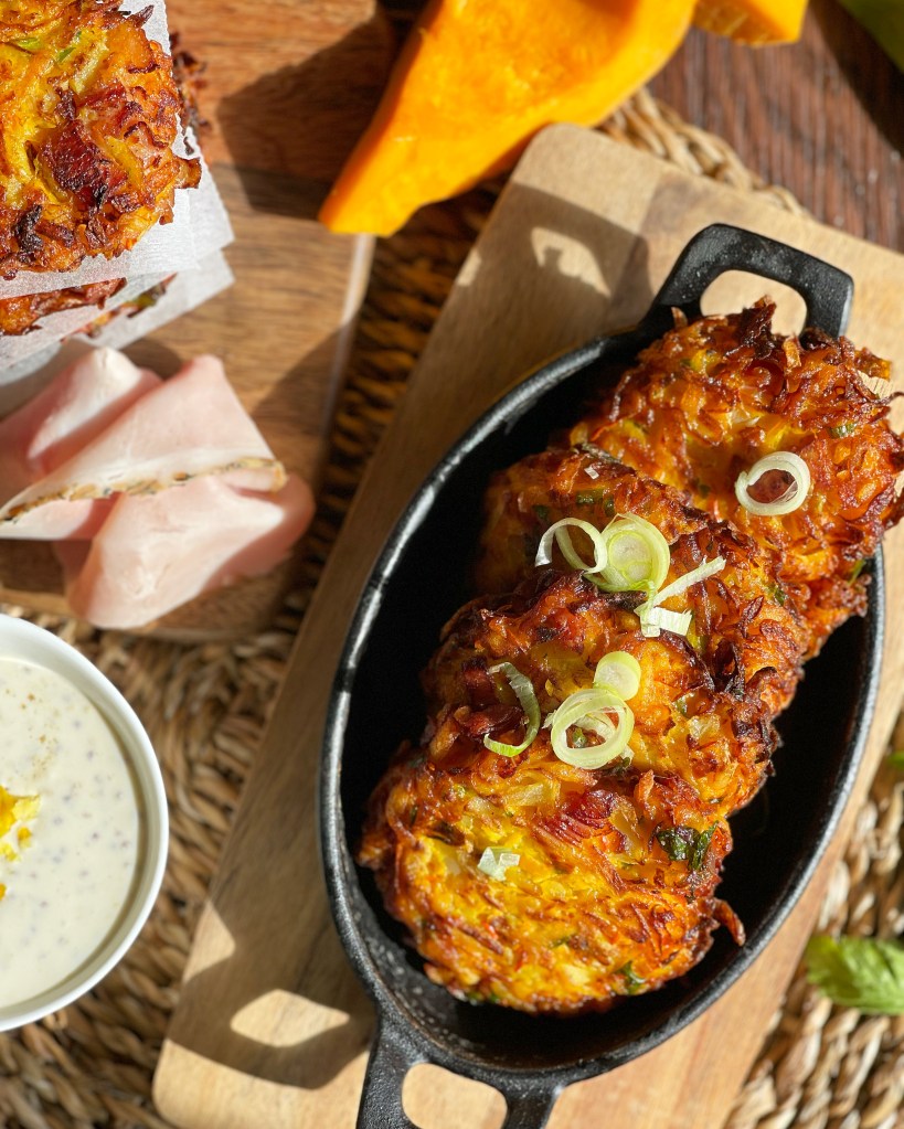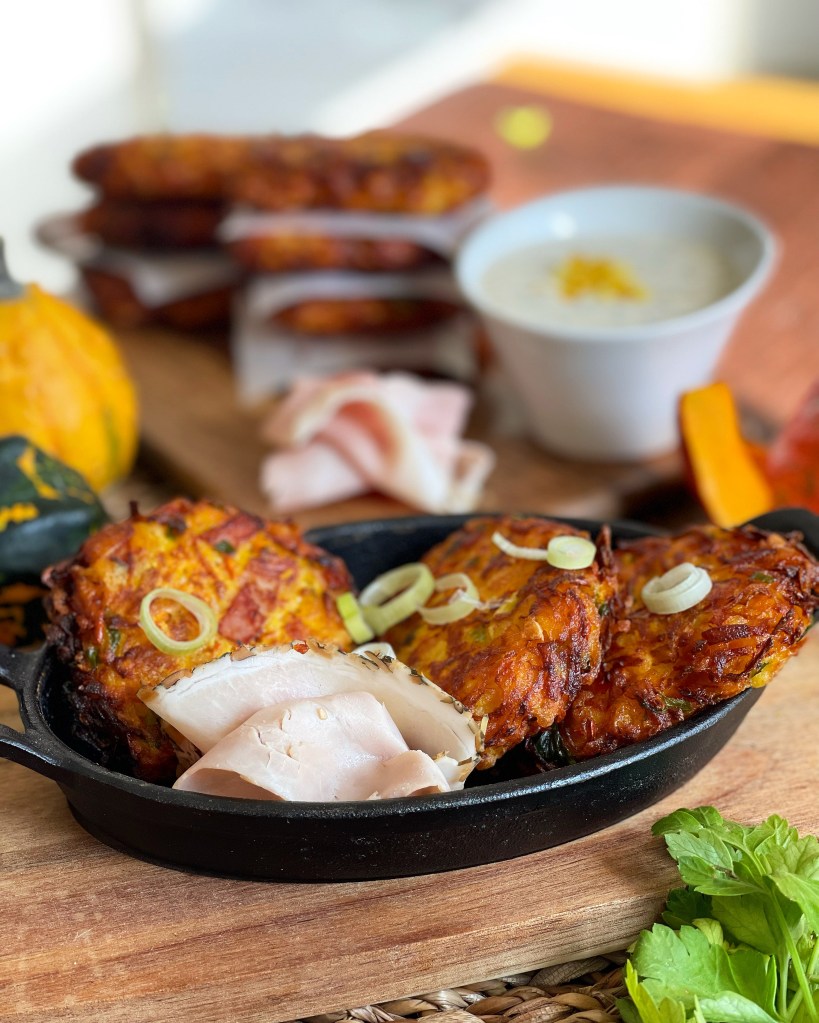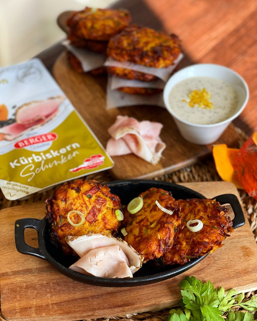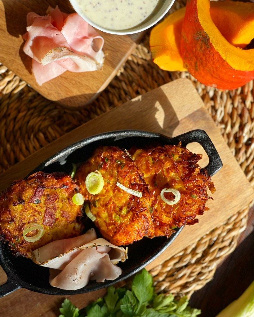Ich habe mir also überlegt: „Wie kann ich den Schinken und den Kürbis so in Szene setzen, dass sie trotzdem beide gleich zur Geltung kommen?“ Eine meiner liebsten Speisen, egal ob Winter oder Herbst sind Kartoffelpuffer. Die gehen für mich das ganze Jahr. Entweder schön mit Knoblauch bestrichen oder doch nur mit einem Dip dazu.