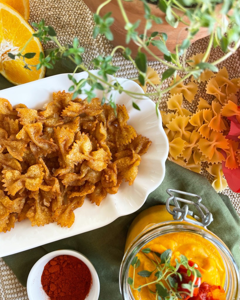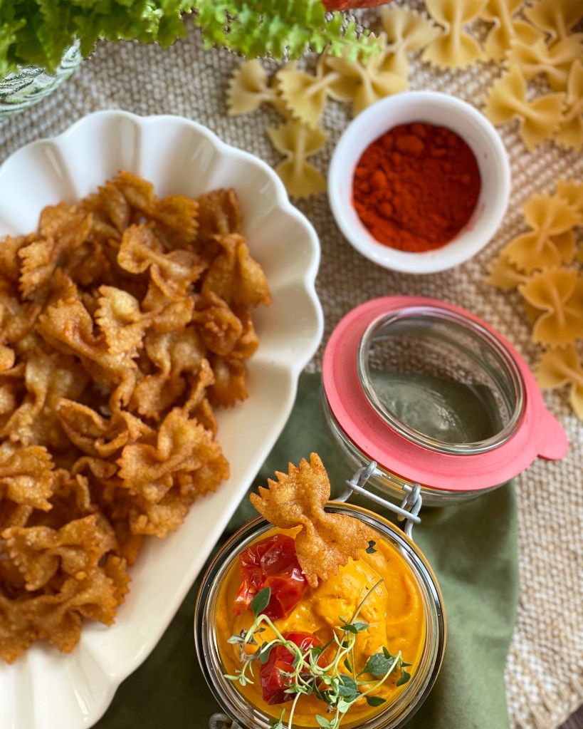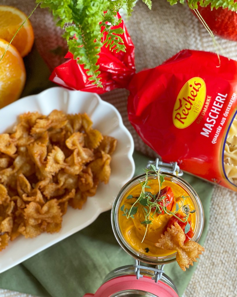 In meinem anderen Rezept habe ich euch die Nudelchips als Beilage präsentiert. In diesem sind sie jedoch der Hauptakteur. Natürlich hab ich, passend zur Saison, auch einen herbstlichen, leckeren Dip für euch dazu vorbereitet.