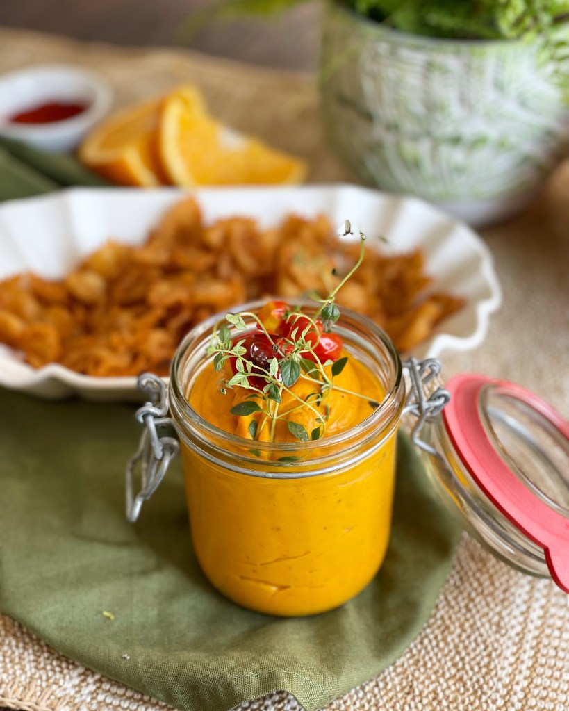 Gebt das Gemüse in einen Mixbecher. Vielleicht müsst ihr die Masse auf zweimal machen, wenn es zu viel ist. Presst die Orange aus und gebt den Saft mit etwas Creme Fraiche und den abgerupften Thymian zum Gemüse und püriert dies. Durch die Wärme kann leicht ein Unterdruck im Gefäss entstehen, also lasst lieber das Behältnis offen. Schmeckt nochmals mit Salz und Pfeffer ab. Als besonderen Tipp hab ich für euch: reibt noch etwas von der Orangenschale in euren Dip. Viele ätherische Öle stecken in der Schale. Achtet aber darauf, dass die Schale auch wirklich zum Verzehr geeignet ist. Schmeckt nochmals ab und schon kann „gechipst“ werden.