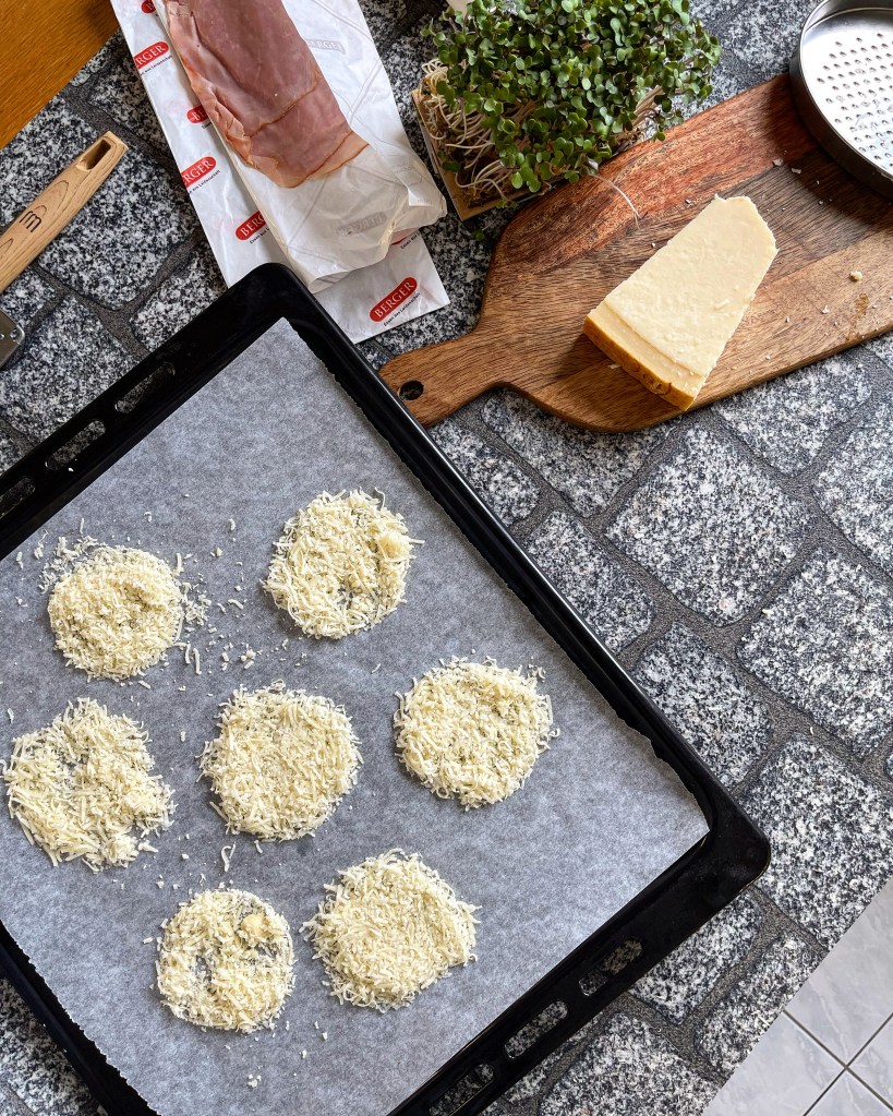 Den Käse setzen wir mit Hilfe eines Ringes auf ein mit Backpapier ausgelegtes Backblech – so wie auf dem Bild. Achtet darauf, dass die Ringe etwa gleich gross und gleich dick sind.