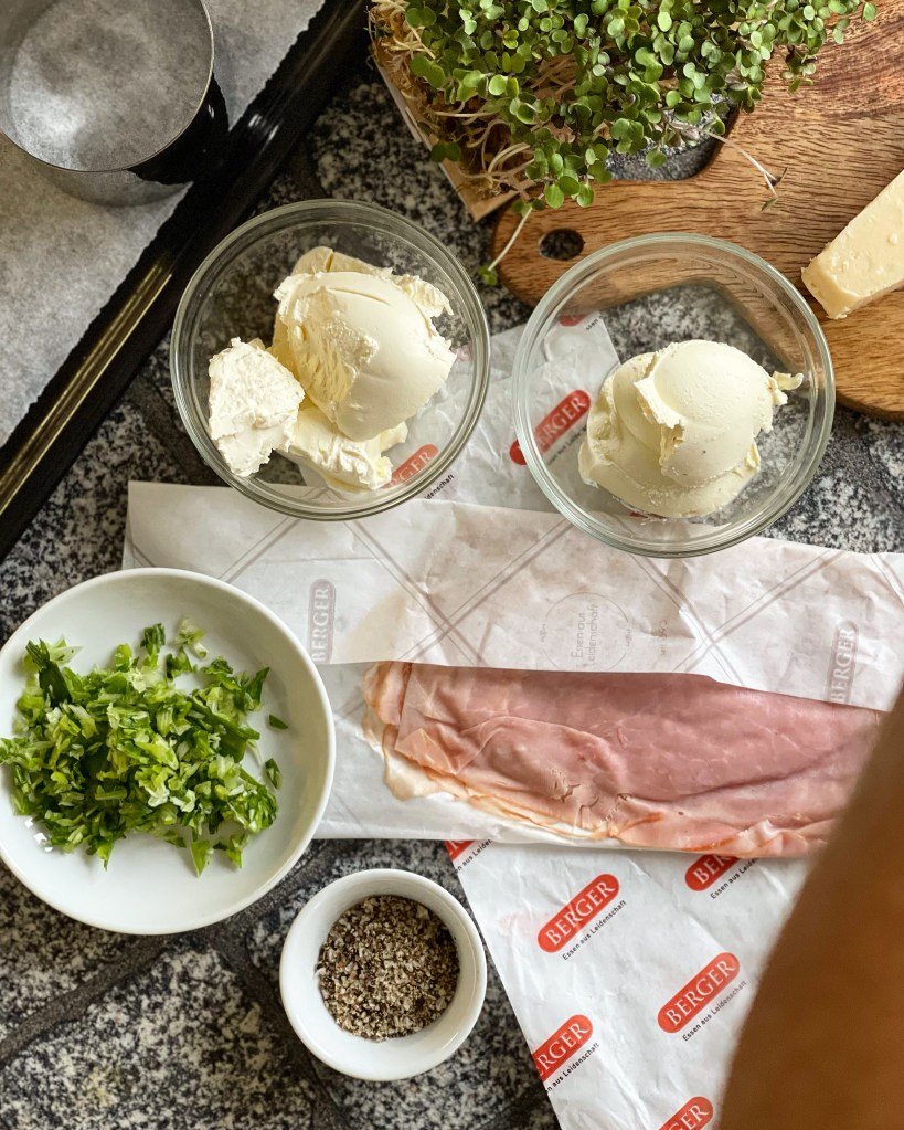 Während der Käse im Backrohr schmilzt, bereiten wir unsere Röllchen vor. Dazu legen wir uns die Schinkenblätter auf und spritzen entlang der Breitseite die Creme hinein. Dann rollen wir diese ein und legen sie bei Seite.