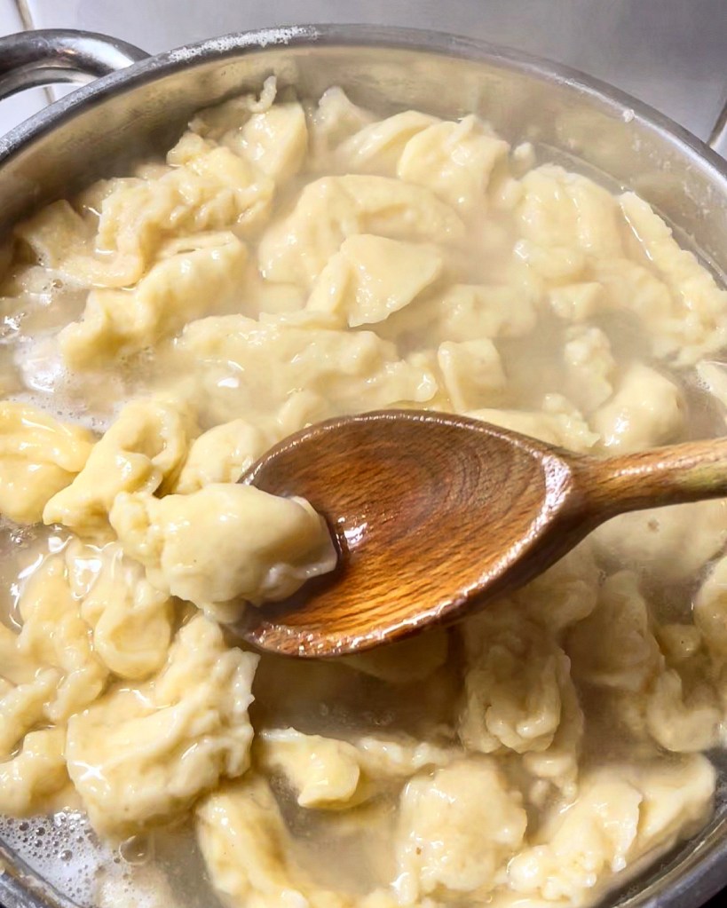 In der Zwischenzeit bereitet ihr einen großen Topf mit Wasser vor und salzt es. Dieses dann zum Kochen bringen. Wenn das Wasser kocht, schabt ihr mit einem Esslöffel Nockerl ins heisse Wasser, dabei immer den Löffel im Wasser absetzen, so bleibt nichts darauf kleben. Die Nockerl bekommen so ihre typische grobe und grosse Nockerlform. Gut 5 Minuten kochen lassen, bis sie alle an der Oberfläche schwimmen.