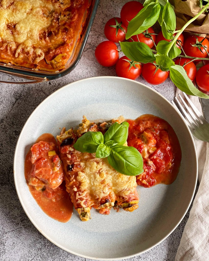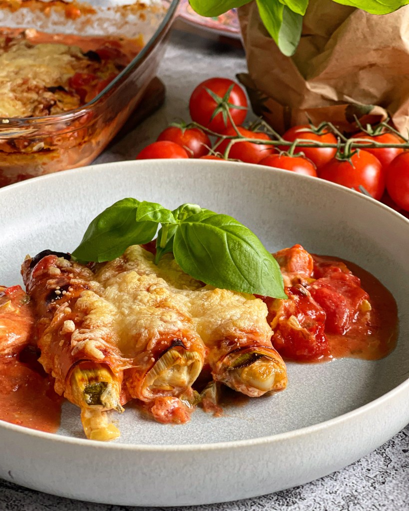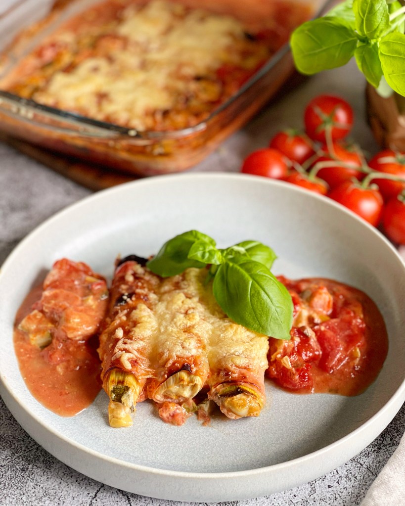 Im nächsten Schritt füllen wir unsere Lauch-Cannelloni mit der Gemüsemasse und legen diese dann zur Seite. Füllt sie nicht zu voll, da ihr euch dann schwerer tut beim Rollen. Habt ihr alle Lauchstangen befüllt, legt euch jeweils ein Schinkenblatt zur Hand und rollt die gefüllten Lauchstangen darin ein. Diese Rolle gebt ihr in die Auflaufform in die Tomatensauce. So einfach entstehen unsere Schinken-Lauch-Cannelloni.