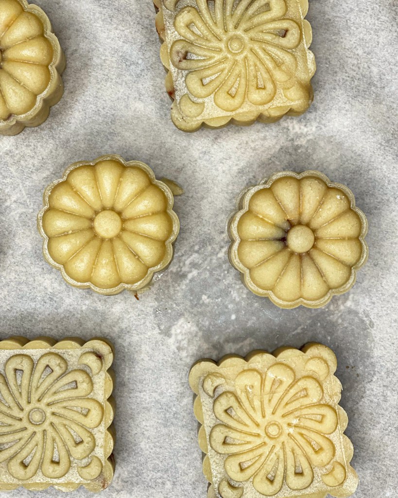 Eure gestanzten Mooncakes setzt ihr nun auf ein Backblech und backt sie bei 180 Grad gut 10 Minuten bis sie leicht Farbe anziehen. In der Zwischenzeit verquirlt ihr das Ei mit etwas Wasser. Nach 10 Minuten Backzeit nehmt ihr das Backblech heraus, lasst ihr die Mondkuchen kurz abkühlen und bestreicht sie dann mit der Eimasse. Dadurch entsteht die schöne, goldbraune Färbung. Nun wieder ins Backrohr für gut 20 Minuten und danach sind sie bereit verschenkt zu werden.