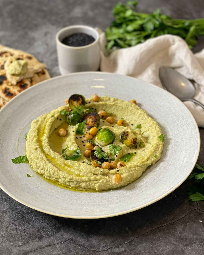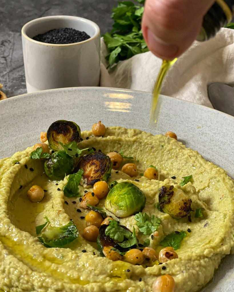 Jetzt bratet noch die restlichen Kichererbsen und gekochten Kohlsprossen mit etwas Öl und Salz in einer Pfanne an und dann könnt ihr im Grunde genommen bereits anrichten. Am leichtesten ist es für mich, wenn ich den Hummus mit Hilfe eines grossen Löffels auf den Teller gebe und in der Mitte eine Einbuchtung mache – so wie ein Vulkan. Etwas Öl darüber, die gebratenen Kichererbsen und Kohlsprossen dazu dekorieren, am Ende mit schwarzem Sesam und frischer Petersilie anrichten und schon könnt ihr geniessen.