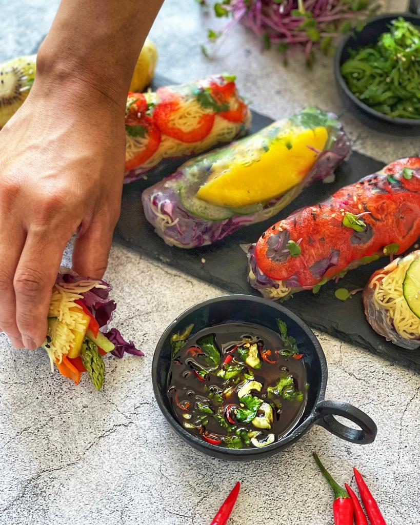 Mein persönlicher Tipp beim Essen: Vor dem ersten Bissen könnt ihr die Roll noch in den Dip tauchen. Um danach zu vermeiden, dass die Füllung in den Dip fällt und nicht umgekehrt, könnt ihr mit einem kleinen Löffel den Dip auf und in eure Roll träufeln.
