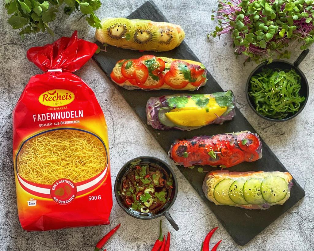 Unser Kniff bei den Rolls ist, dass wir anstatt der klassischen Glasnudeln – ursprünglich stammt dieser Snack aus dem ost- und südostasiatischen Raum-, die Fadennudeln von Recheis verwendet haben. Glaubt mir, den Unterschied merkt man nicht… im Gegenteil, ich finde die Fadennudeln geschmacklich besser.