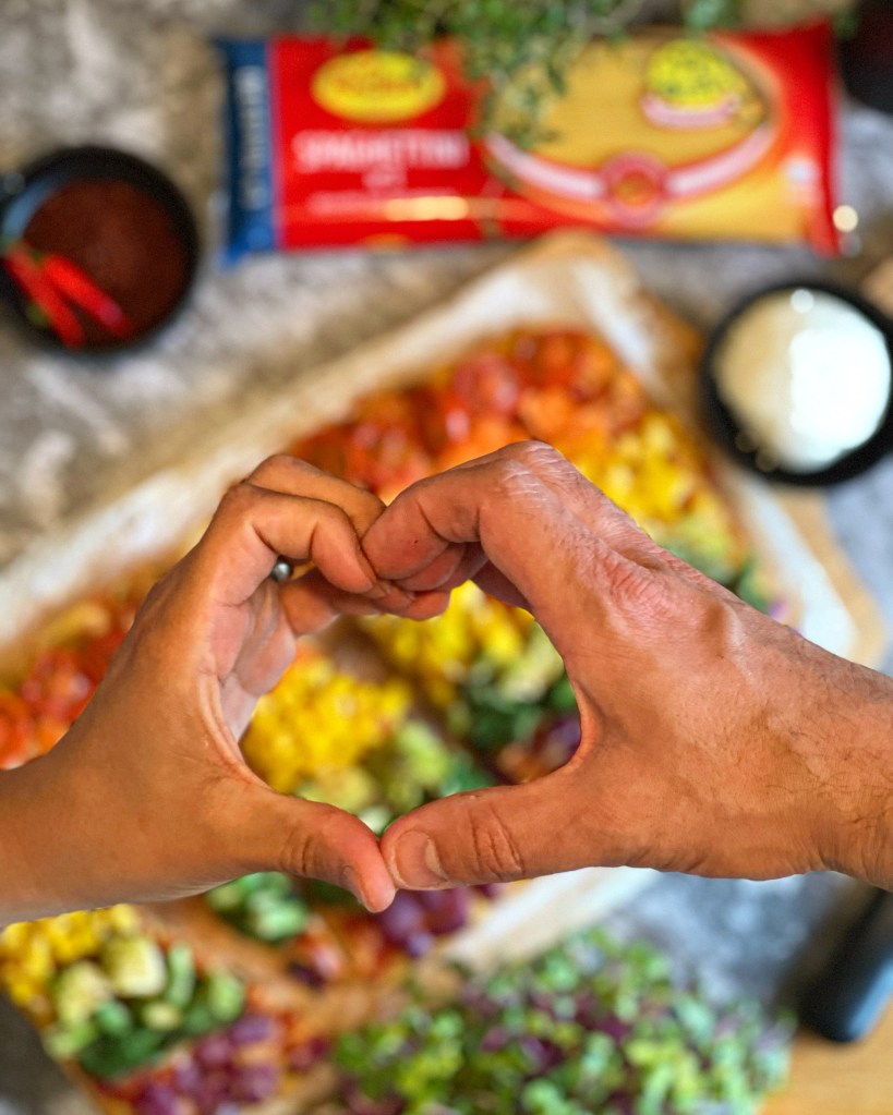 Im letzten Rezeptbeitrag zum Pride Month haben wir euch lecker Sommerrollen gezeigt. Heute wollen wir wieder etwas mehr Farbe bekennen und präsentieren euch unsere neueste Spezialität: eine bunte, vegetarische Pizza, deren Boden aus Nudeln besteht. Auch hier könnt ihr sehr kreativ werden! Lest weiter für kunterbunten Pizza-Spaß!