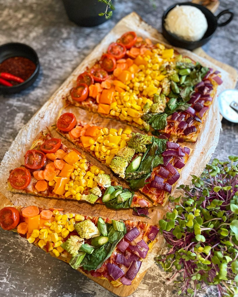 Um den Belag so farbenfroh und bunt wie nur möglich, eben wie einen Regenbogen, zu machen, haben wir uns im Gemüsegarten bedient. Der offizielle Pride Regenbogen hat bekanntlich 6 Farben, nämlich ROT – ORANGE – GELB – GRÜN – BLAU – VIOLETT. Jede Farbe hat ihre eigene Bedeutung, die sie repräsentiert. So haben wir uns beim passenden Gemüse für Tomaten, Karotten, Paprika – gelb und orange-, Mais, Romanesco, Babyspinat und rote Zwiebeln entschieden. Also lauter leckere Sachen, die man gern auf einer vegetarischen Pizza hat. Selbst Fleischliebhaber wird die Regenbogenpizza schmecken.