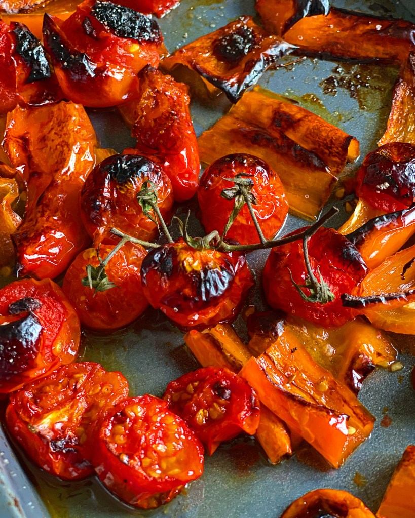 Um dieser Hummusvariante seine Besonderheit zu geben, müssen wir zuerst das Gemüse, sprich Paradeiser und Paprika im Backrohr anrösten. Dazu schneidet ihr beides grob zusammen und gebt es mit dem Knoblauch und etwas Olivenöl in eine Auflaufform. Lasst das alles bei 180 Grad gut 30 Minuten garen, bis es Farbe annimmt.