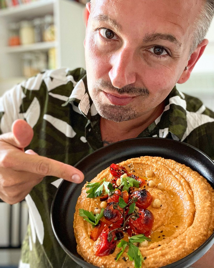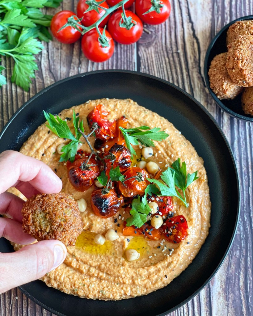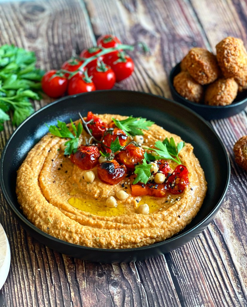 In meiner Hummus Variante hier wird auch zuerst der Paprika, die Paradeiser und der Knoblauch im Backrohr gebraten, damit sich nämlich köstliche Röstaromen bilden, um im Anschluss mit den restlichen Zutaten vermengt zu werden.