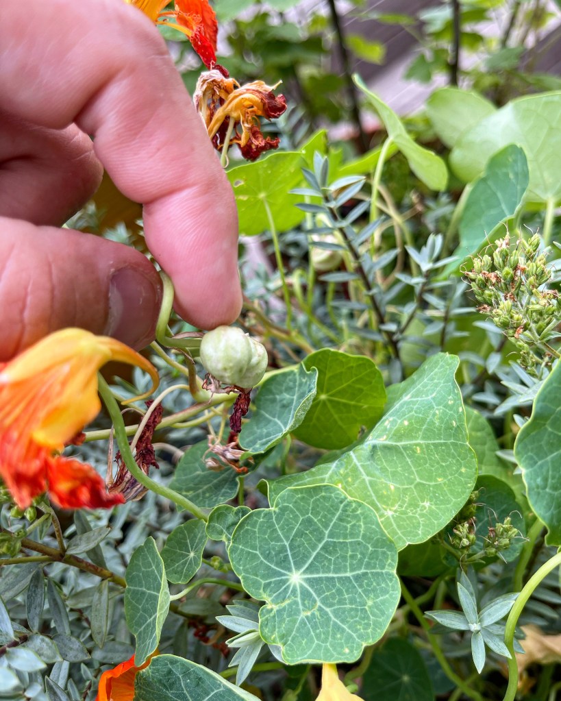 Habt ihr denn schon gewusst, dass man die Samen der Kapuzinerkresse in Essig einlegen kann und diese ein bestens geeigneter Ersatz für Kapern sind? Solltet ihr zu wenig Samen haben, könnt ihr auch die geschlossenen Blüten verwenden. Die Verarbeitung der Samen ist ganz einfach. Einfach für 2 Tage in Salz zum Austrocknen legen, danach mit Essig und Gewürzen einlegen – wie man das eben auch mit Kapern macht – und eine Woche ziehen lassen. Die Essigmarinade, die dabei entsteht, habe ich später in diesem Rezept zum Würzen des veganen Beuschels verwendet.