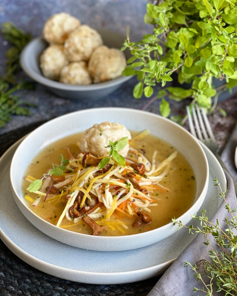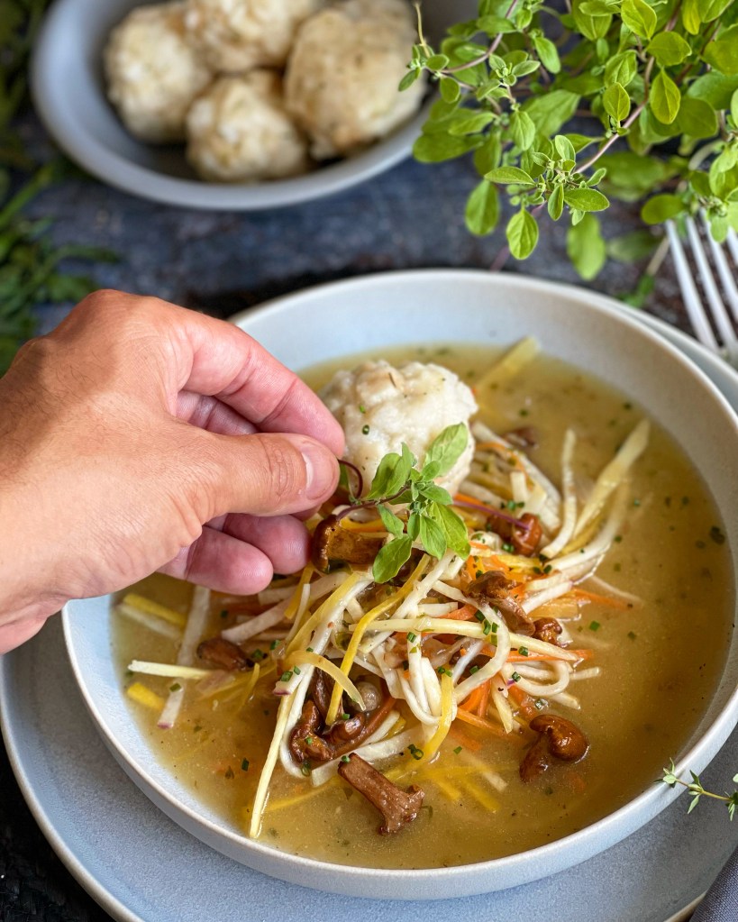 Mein Beuschel oder, besser gesagt, Veuschel ist komplett vegan. Genau wie die Semmelknödel, die klassischer Weise als Beilage serviert werden, und auch die typische saure Rahmsauce.