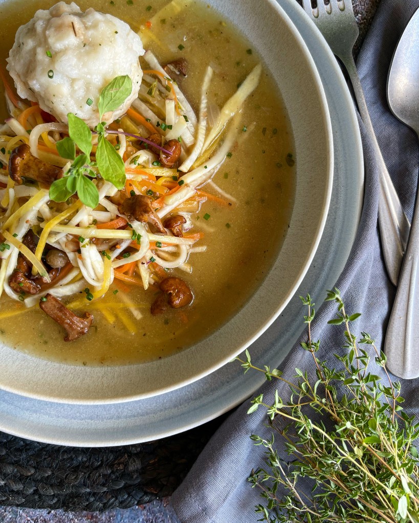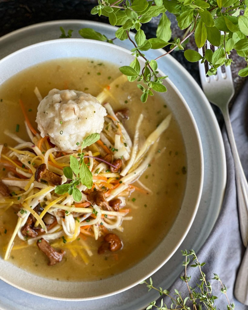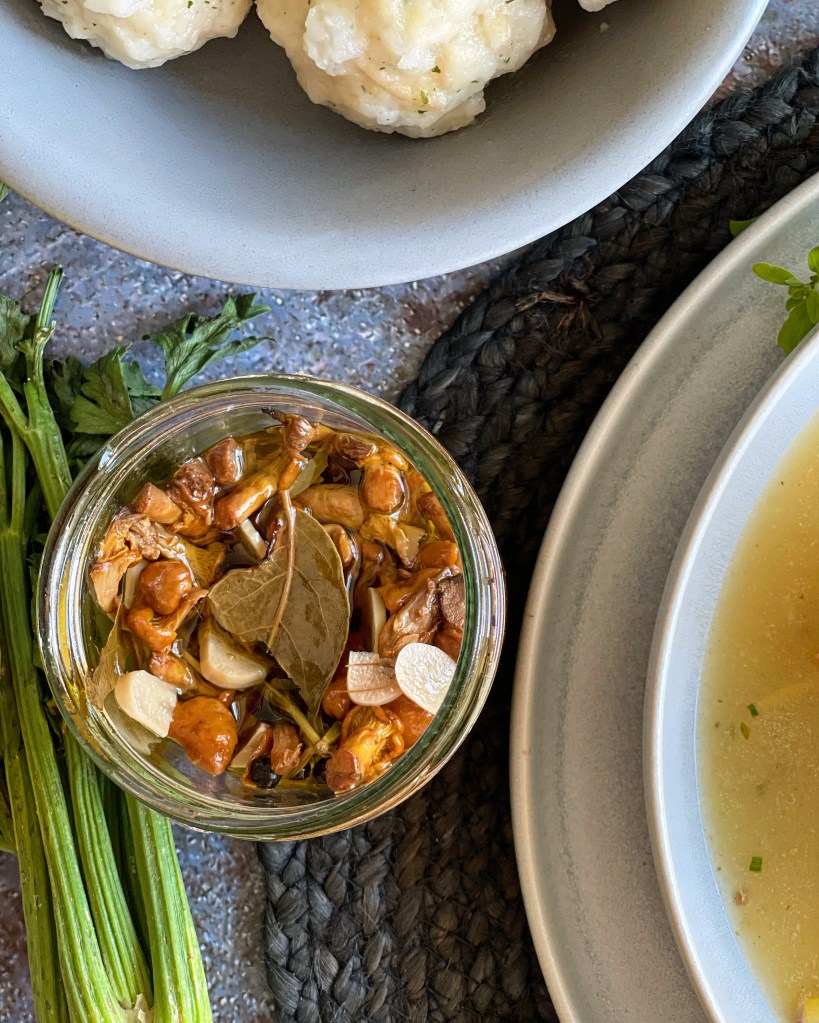 In vielen Rezepten liest man, dass Kräuterseitlinge verwendet werden, aber ich habe meine eingelegten Eierschwammerl verwendet, die harmonieren perfekt. Bei diesem Gericht dauert die Vorarbeit etwas länger als die Zubereitung. Deswegen sage ich: „Auf, auf! Wir legen jetzt los!“