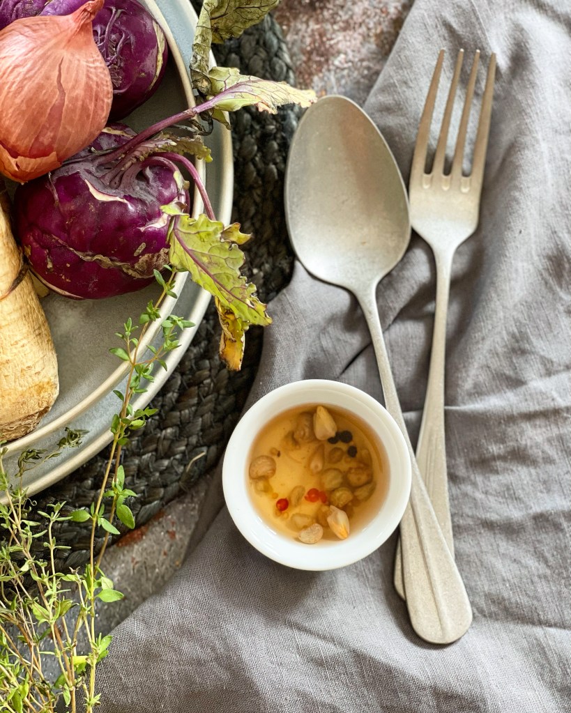 Abgesehen davon, dass das Rezept einfach ist und es wirklich jede:r zu Hause kochen kann, greife ich hier wieder Themen wie Nachhaltigkeit, Regionalität, Saisonalität und #zerowaste auf. Warum? Aus den Schalen und Abschnitten des Gemüses habe ich eine Würzbasis für Suppen hergestellt. Dazu einfach alles sehr fein hacken, fast schon gemahlen, und in Gläser füllen. Wie anfangs erwähnt, habe ich den Essig von den Kapuzinerkressesamen oder Kapern nicht weggeschüttet, sondern in das Gericht integriert.