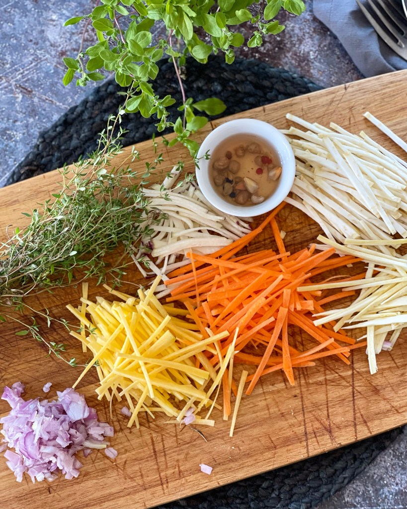 Es gibt nämlich Julienneschneider oder auch Maschinen. Ich persönlich habe das Gemüse geschält und mit einer Hobel dünn geschnitten, anschließend die Scheiben in sehr dünne Streifen geschnitten.