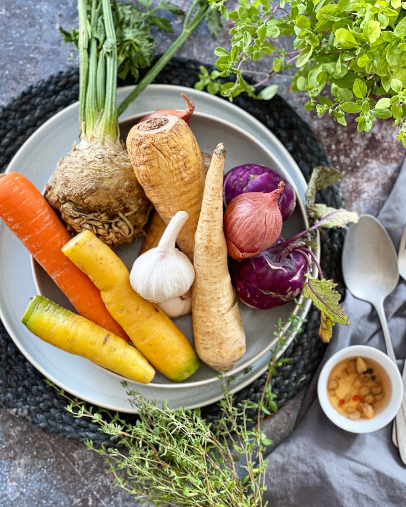 Bei der Auswahl meiner Zutaten habe ich mich wieder ganz auf das regionale und saisonale Angebot des österreichischen Saisonkalenders verlassen. Neben dem gängigen Wurzelwerk habe ich mich noch entschieden Pastinake, Petersilienwurz und violetten Kohlrabi zum Kochen verwenden.