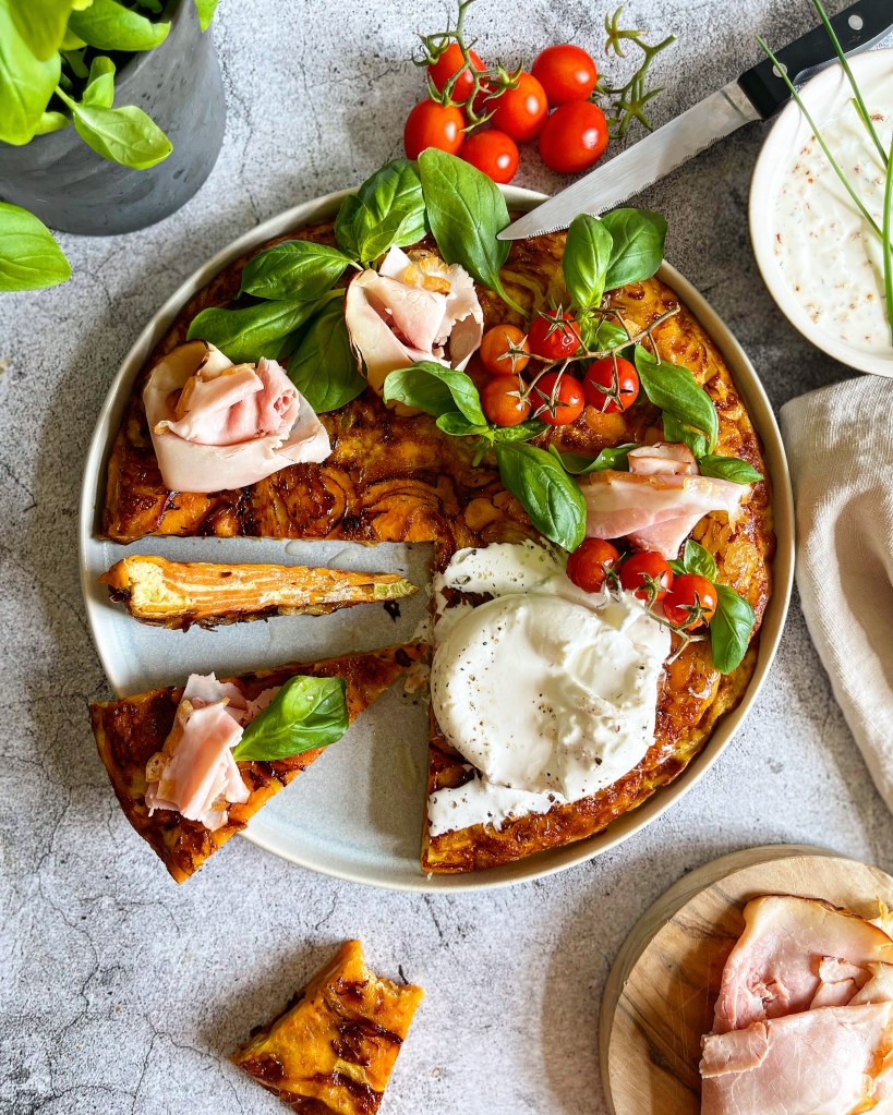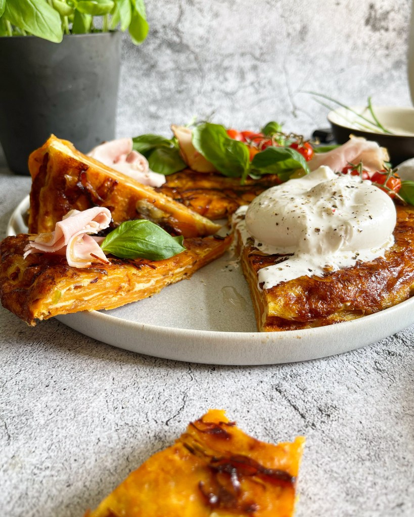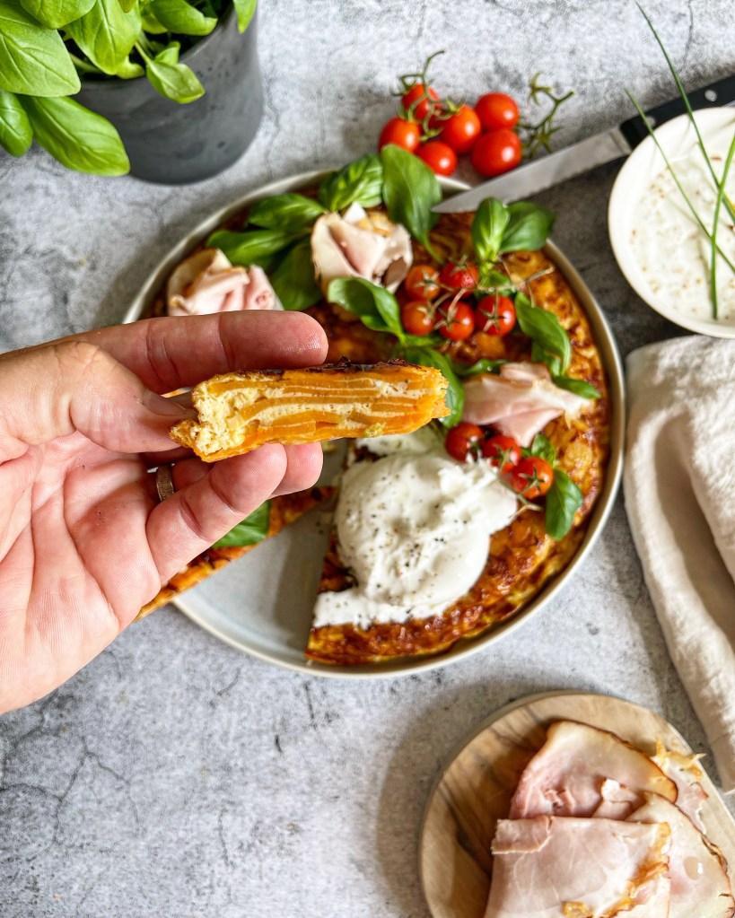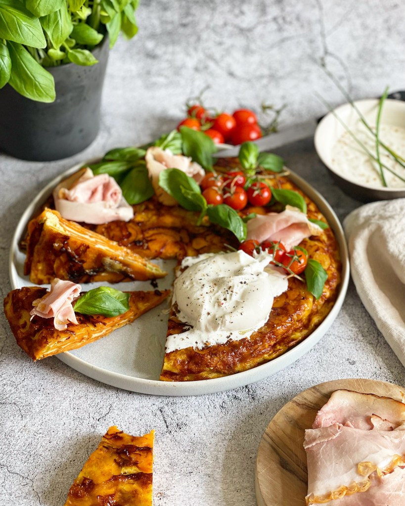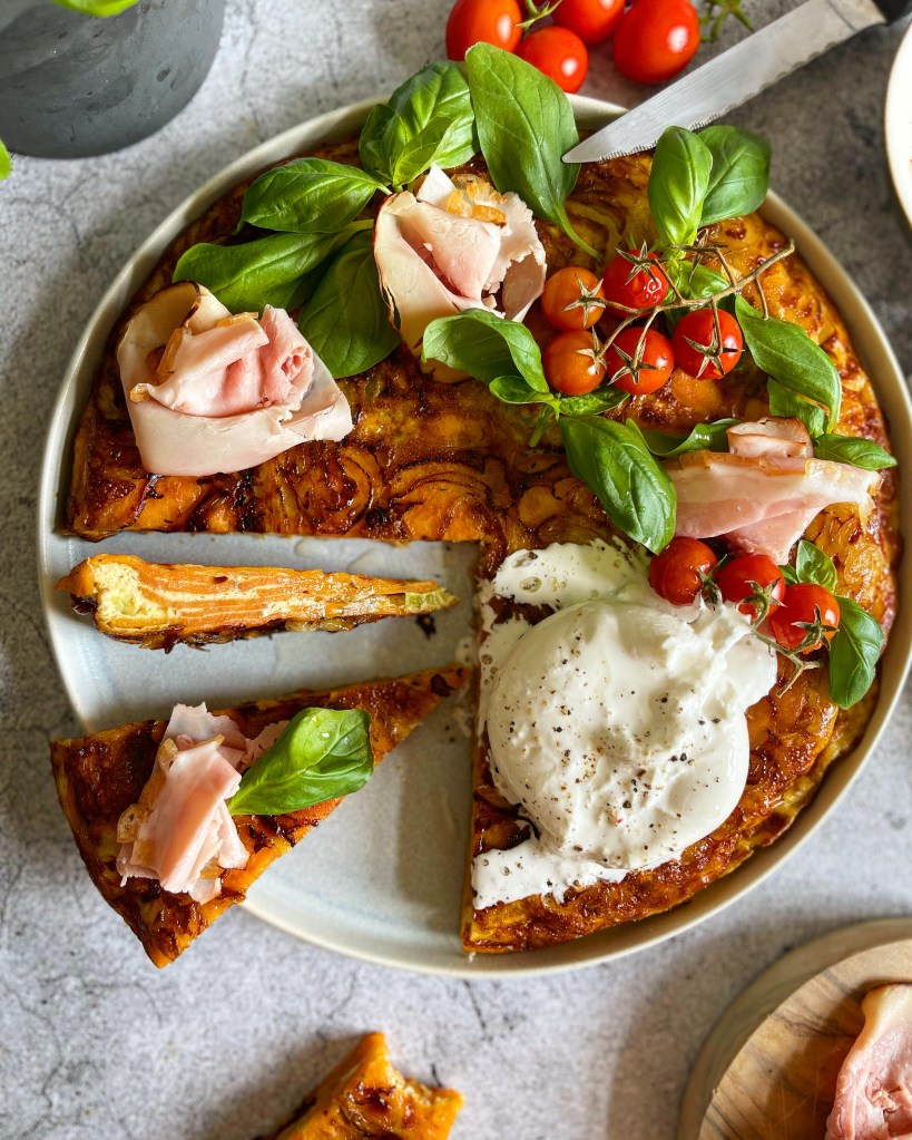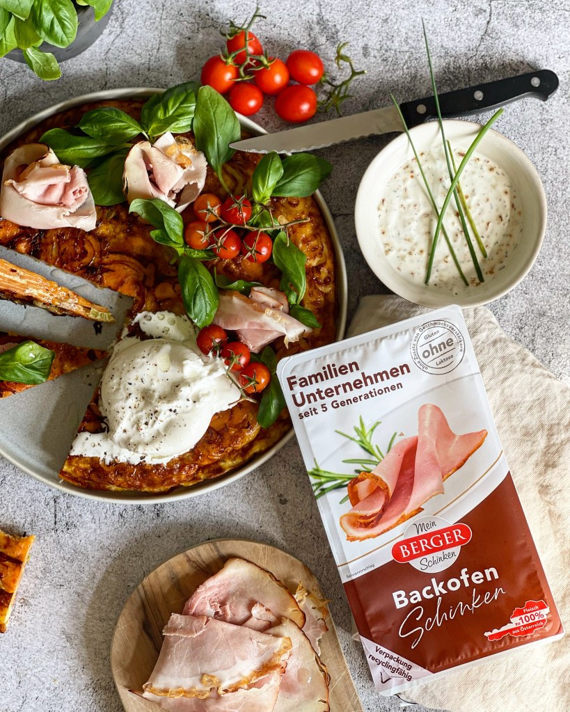 Ich aber möchte euch ein ganz einfaches Rezept zeigen, wo wir am Geschmack der Süsskartoffel nicht viel ändern. Dünn aufgeschnitten mit einer Milch-Ei-Mischung, die in der Pfanne gebraten wird und mit leckerem Schinken und einer Burrata getoppt wird. Entschieden habe ich mich hier für den Backofen Schinken aus dem Hause Berger Schinken. Dieser ist etwas rustikaler und herzhafter im Geschmack und passt somit wunderbar zu unseren Süsskartoffeln.