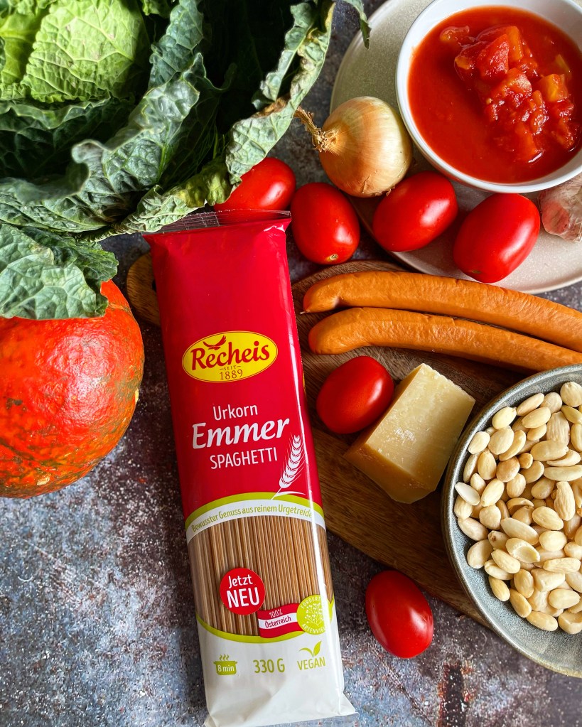 Also, der ursprüngliche Plan war es, eine andere Nudelsorte aus der aktuell neuen Serie von Recheis zu verwenden. Im letzten Rezeptbeitrag waren die Urkorn Emmer Nudeln in Verwendung, die neu im Recheis-Sortiment sind.