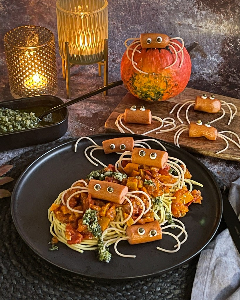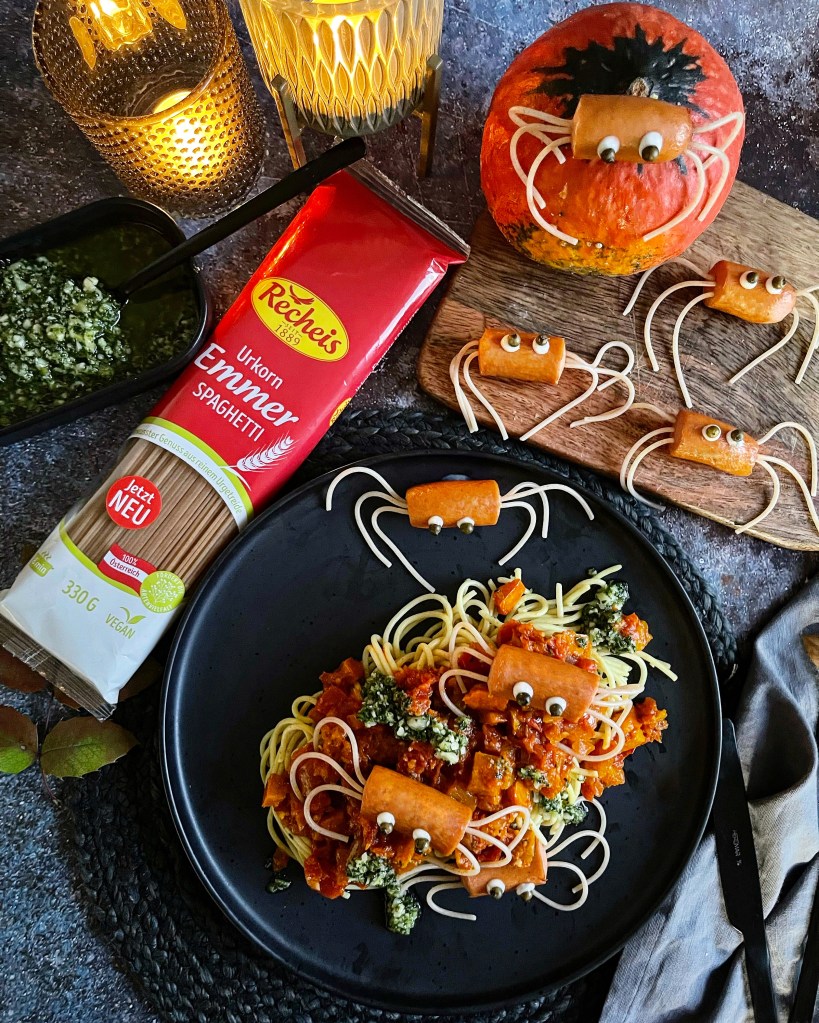 Irgendwo habe ich irgendwann mal gesehen, dass man Spaghetti durch kleine Würstel stecken kann, sie dann gemeinsam kocht und anschließend mit der Tomatensauce serviert. Dies habe ich mal bei den Kindern meiner besten Freundin gemacht. Sie fanden die Idee so lustig und haben es geliebt. Dabei kam mir die Idee, dass man auch daraus Spinnen zaubern könnte. Und statt der klassischen Tomatensauce gibt es ein saisonal angepasstes Kürbisragout dazu. Ich bin mir sicher eure Kinder haben genau so viel Spass dabei, euch beim Kochen zu unterstützen.