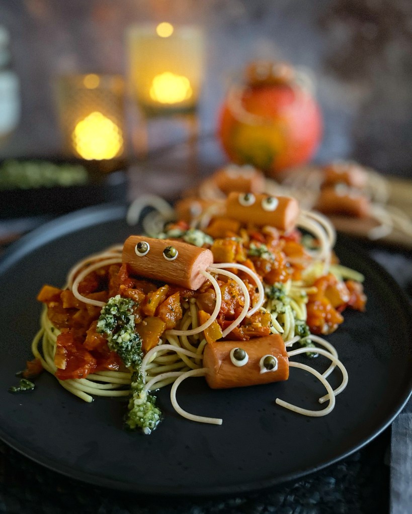Und jetzt können wir auch schon anrichten. Die Kinder haben bestimmt schon Hunger. Ich habe mit einer Fleischgabel die gekochten Spaghetti auf den Teller gedreht und das Kürbisragout darüber gegeben. Unsere Halloween-Spinnen habe ich vorsichtig auf dem Teller platziert und die Beine schön zur Seite ausgebreitet. Schließlich soll man die Kraxler gut erkennen können. Am Schluss noch etwas vom Kohlpesto dazwischen um noch mehr Gruselfaktor zu erreichen und schon ist das Halloween Gericht fertig,
