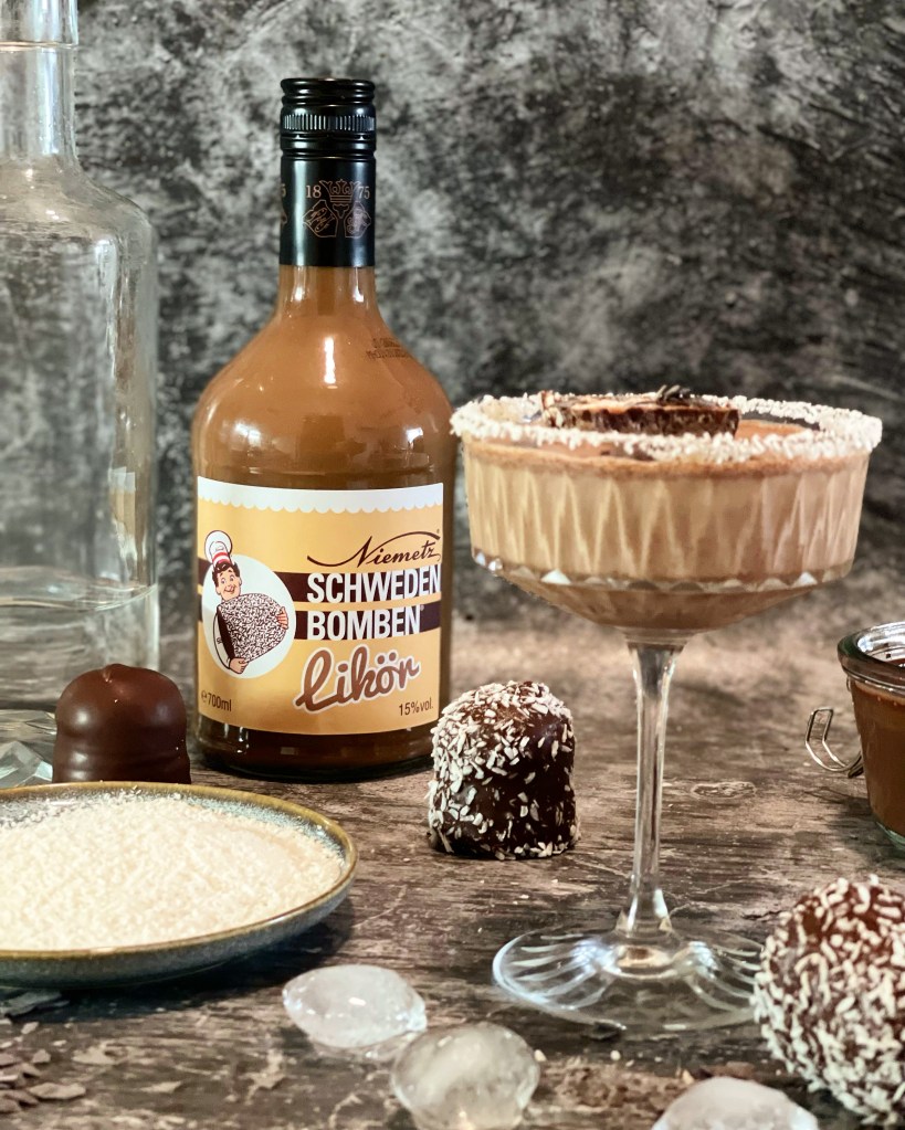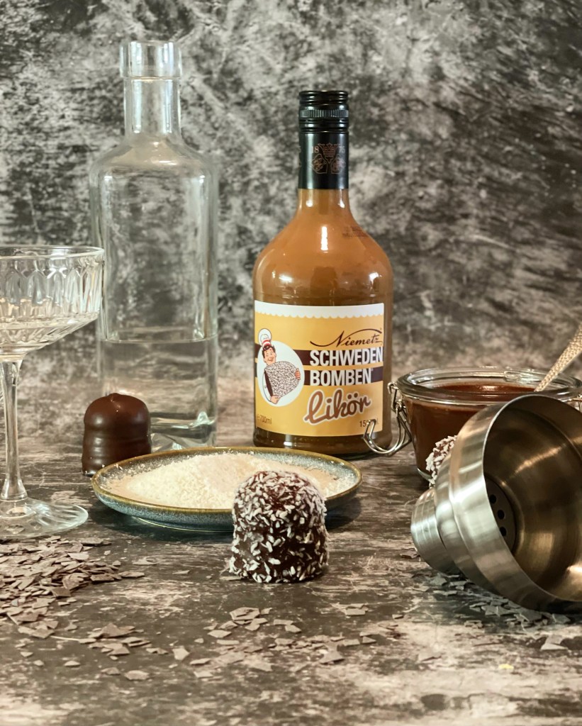 In den klassischen Schokolade-Martini-Cocktail kommt üblicherweise Milch oder Schokolikör. In meiner Variante stellen wir eine Zartbitterschokolade-Ganache her und verfeinern diese im Drink mit dem Schwedenbombenlikör.