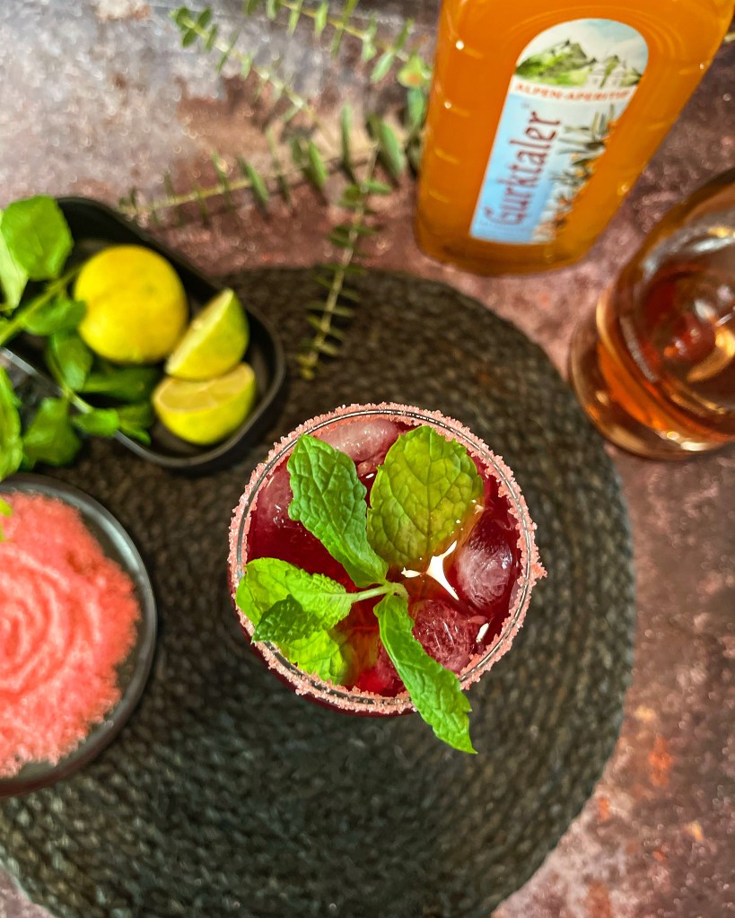 Es begann so… Ich hatte einen langen Content Day, wo ich einige Rezepte geshootet habe und dann einfach ein gutes Glas Rosé-Sekt trinken wollte. Ich hatte aber noch etwas rote Rübensaft über. Außerdem fiel mir noch der Sanddorn Gurktaler ein, den ich mal gewonnen hatte.