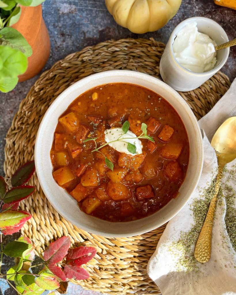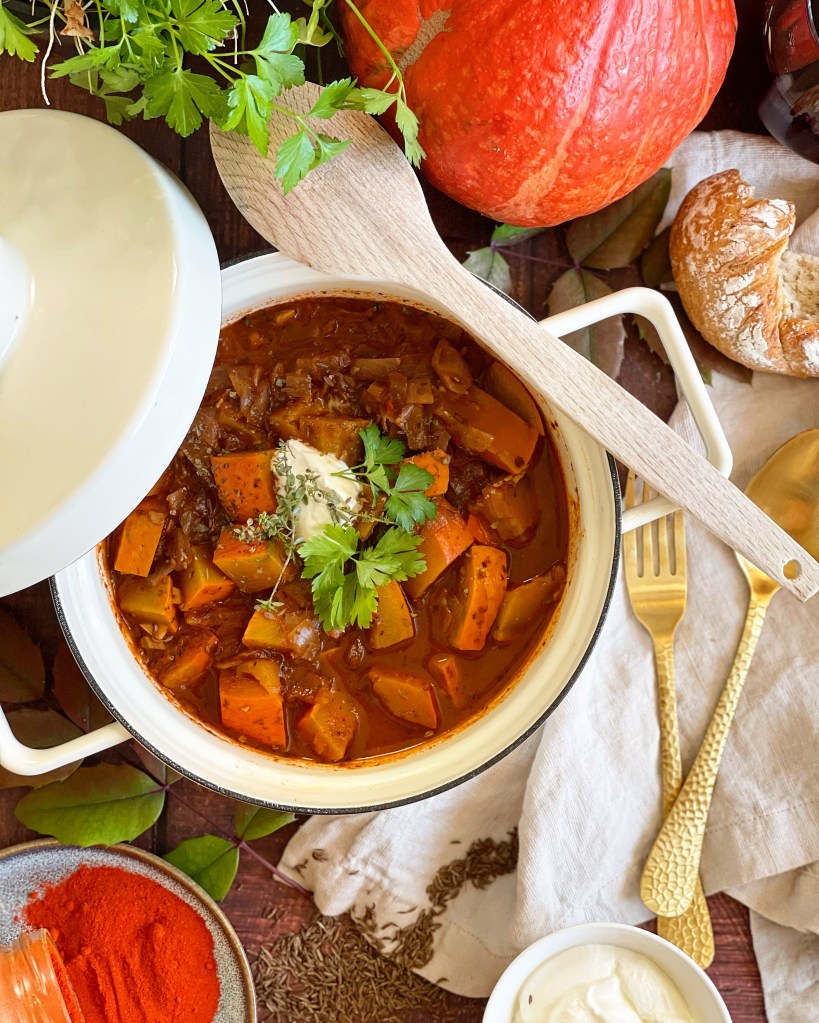 Wenn ihr keinen Kürbis wollt oder mögt, könnt ihr natürlich auch Kartoffeln verwenden. Das Kartoffelgulasch ist nicht weniger schlecht und ist die vegane Alternative zum Rindsgulasch.