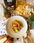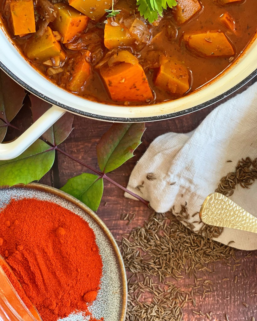 Ein Gulasch benötigt ein wenig Vorarbeit, aber kocht sich im Grunde von alleine. Normalerweise sage ich immer wieder, verwendet Hokkaido, denn den müsst ihr nicht schälen, aber für dieses Rezept habe ich einen Butternut Squash verwendet. Das „Fleisch“ bleibt etwas fester nach dem Kochen und zerfällt nicht so leicht.