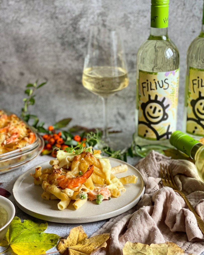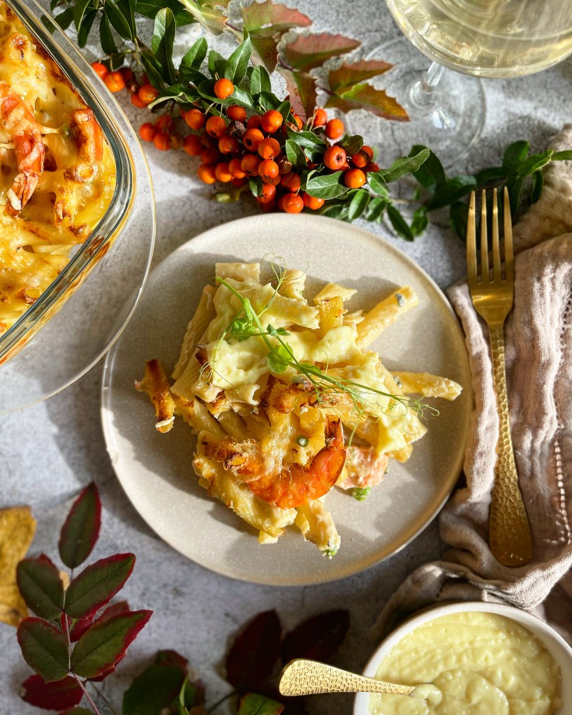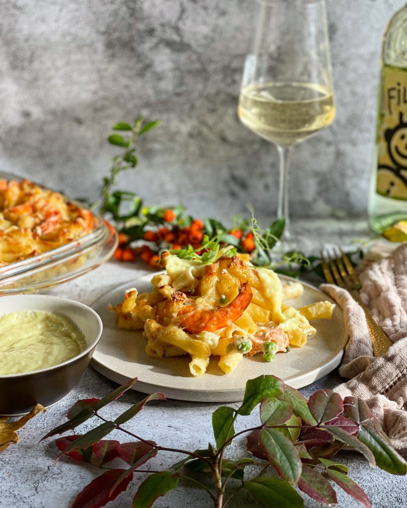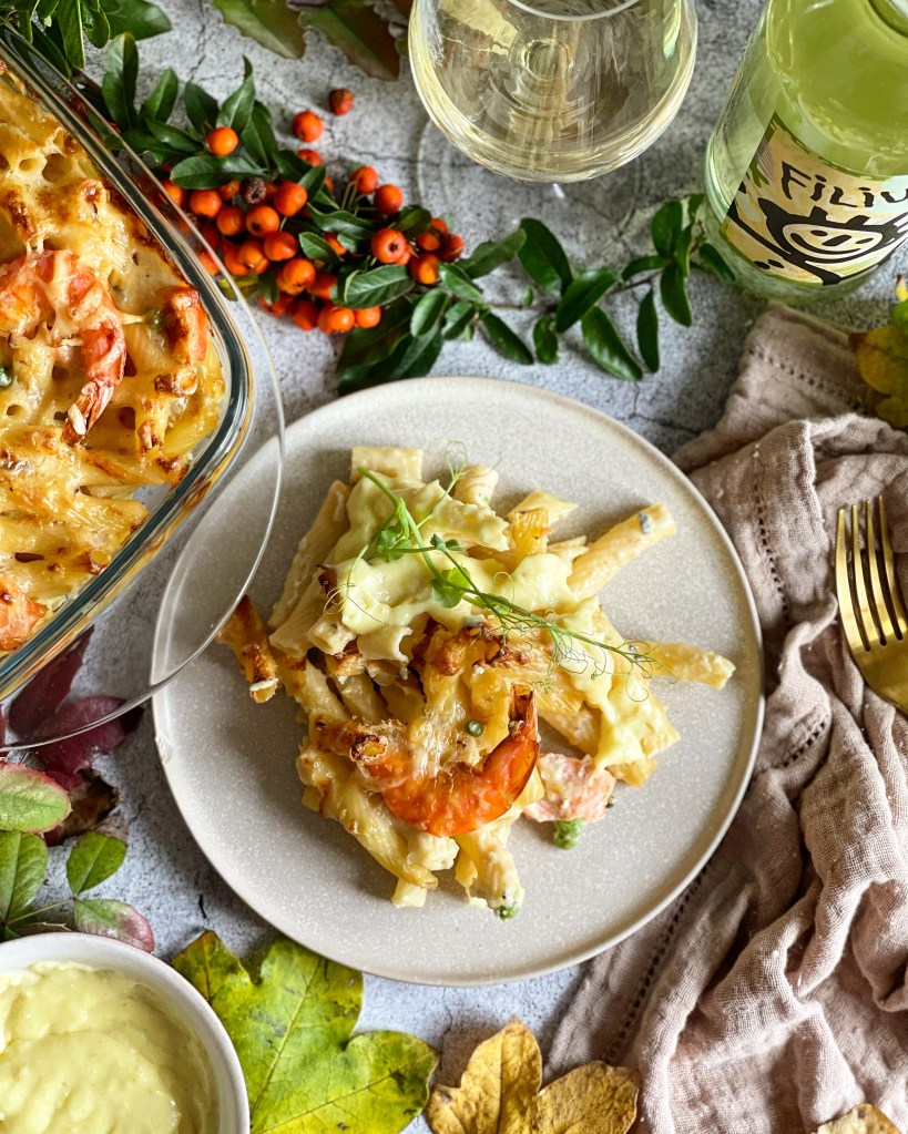 Die nächsten Schritte gehen recht schnell. Legt eine Auflaufform mit Backpapier aus und gebt die (fast) gekochten Nudeln hinein. Verteilt die Erbsen und den Fisch darunter und gießt die Käsesauce darüber. Oben drauf könnt ihr die Gambas legen. Viele wollen Gambas nicht, deswegen kann man sie oben leichter finden und herauspicken.