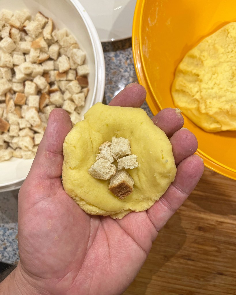Formt nun aus der Masse etwa 10-12 Knödel und füllt diese wie links am Bild mit ein paar Semmelwürfel. Ihr seht, die Masse ist nicht zu weich, sondern hat eine perfekte Konsistenz.