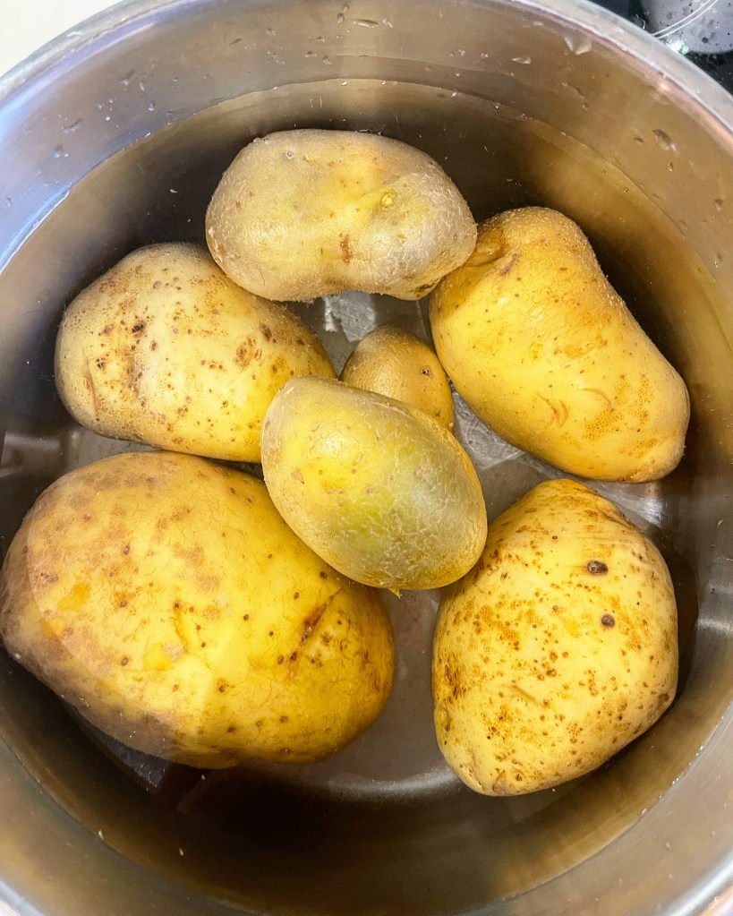 Die Erdäpfel am besten mit der Schale kochen, denn ich habe die Beobachtung gemacht, dass sie so weniger wässrig werden. Die Schale dient somit als Schutzschild sozusagen. Achja, das Wasser leicht salzen.
