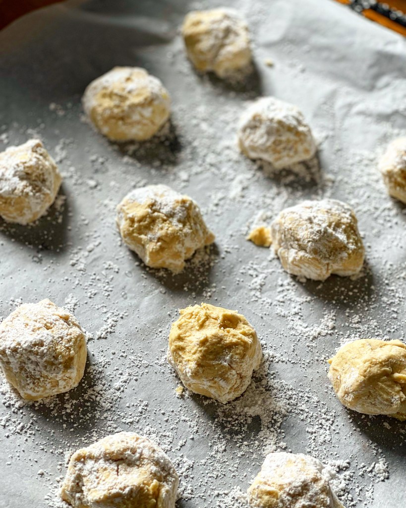 Mit Hilfe eines Eiskugelformers oder auch nur mit Löffeln, formt ihr ca. 4 cm grosse Kugeln und wälzt diese in Staubzucker.