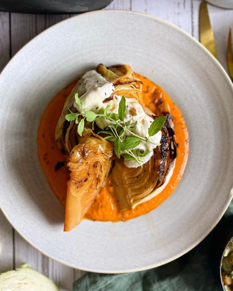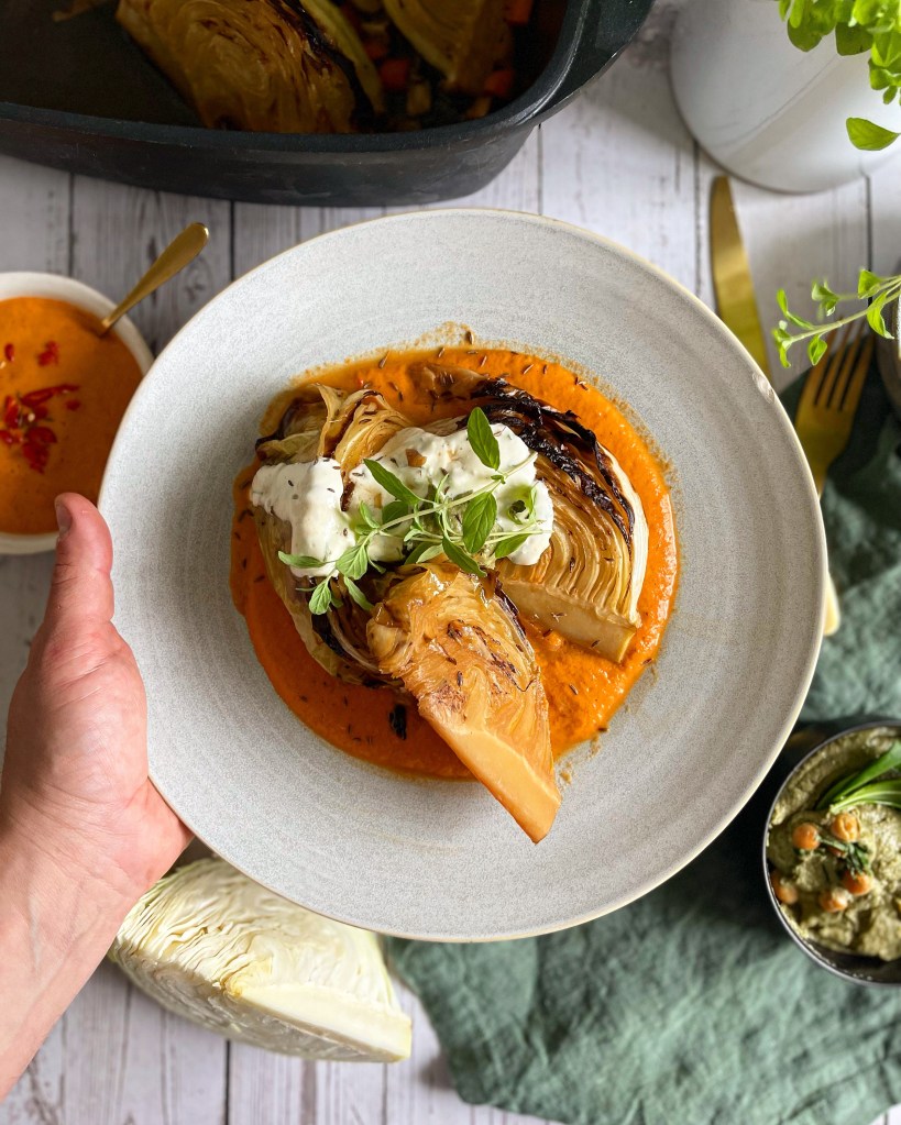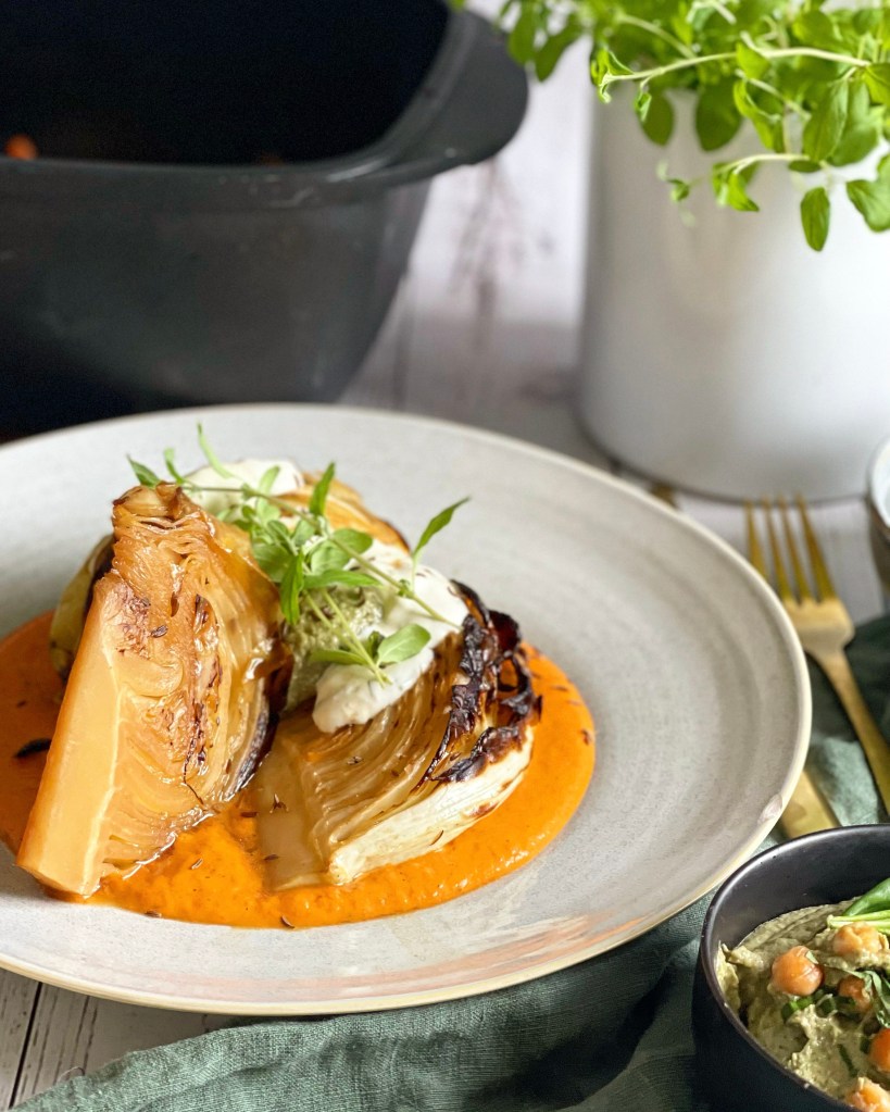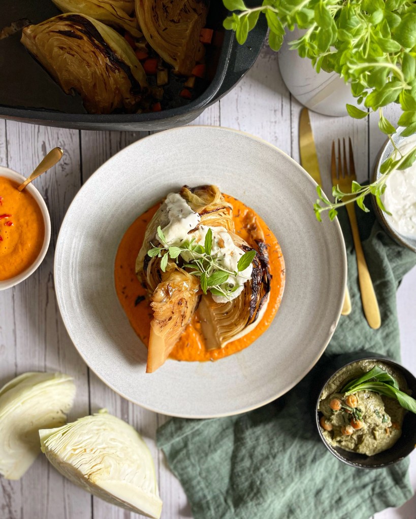 Beim Anrichten würde ich euch empfehlen, zuerst die Sauce auf den Teller zu verteilen, das Kraut darauf zu setzen und mit etwas Bratensaft zu verfeinern. Und als Krönung zum Schluss noch mit dem Bärlauch-Humus und dem Kräuterdip abrunden.