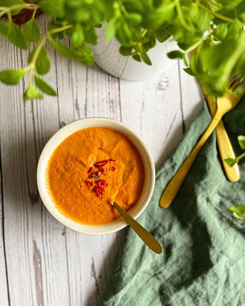 Haben wir die gewünschte Farbstufe erreicht, geben wir das Röstgemüse in ein hohes Gefäß, fügen den Frischkäse hinzu und pürieren alles fein.