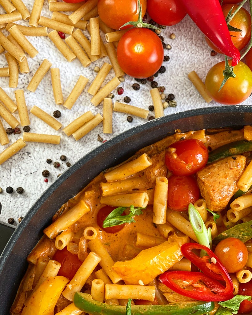 Im letzten Schritt fügt ihr die gekochten Naturgenuss Dinkel Makkaroni direkt aus dem Nudelwasser und das angebratene Hühnerfleisch wieder der Pfanne bei und vermengt alles gut.