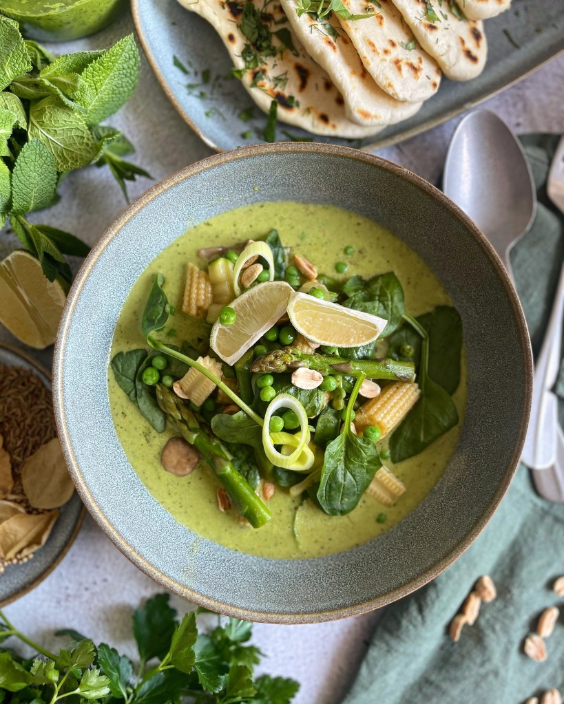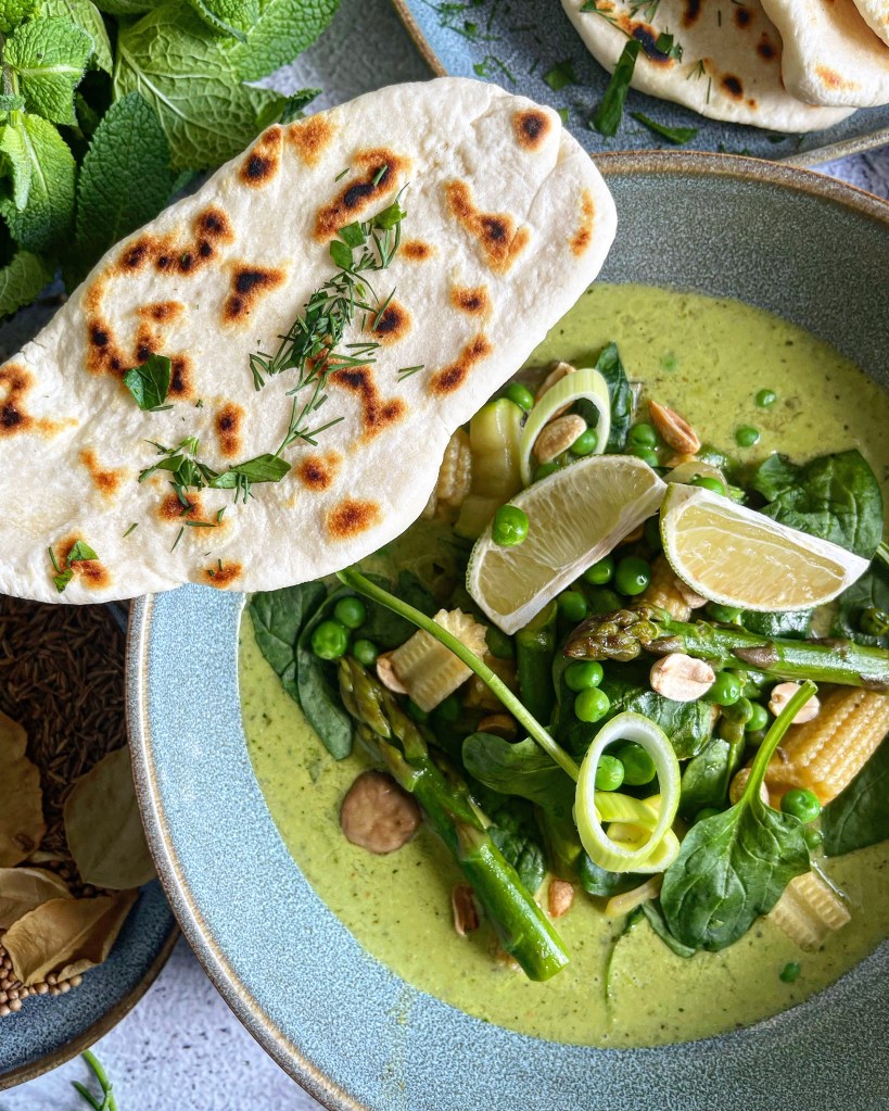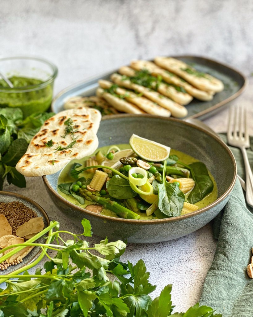 Und dann geht es auch schon ans Anrichten. Als Beilage könnt ihr Reis, Nudeln oder, so wie ich, schnelles Naanbrot servieren. Mit einer Limette toppen, denn etwas extra Säure schadet dem Curry nicht. Ganz im Gegenteil.