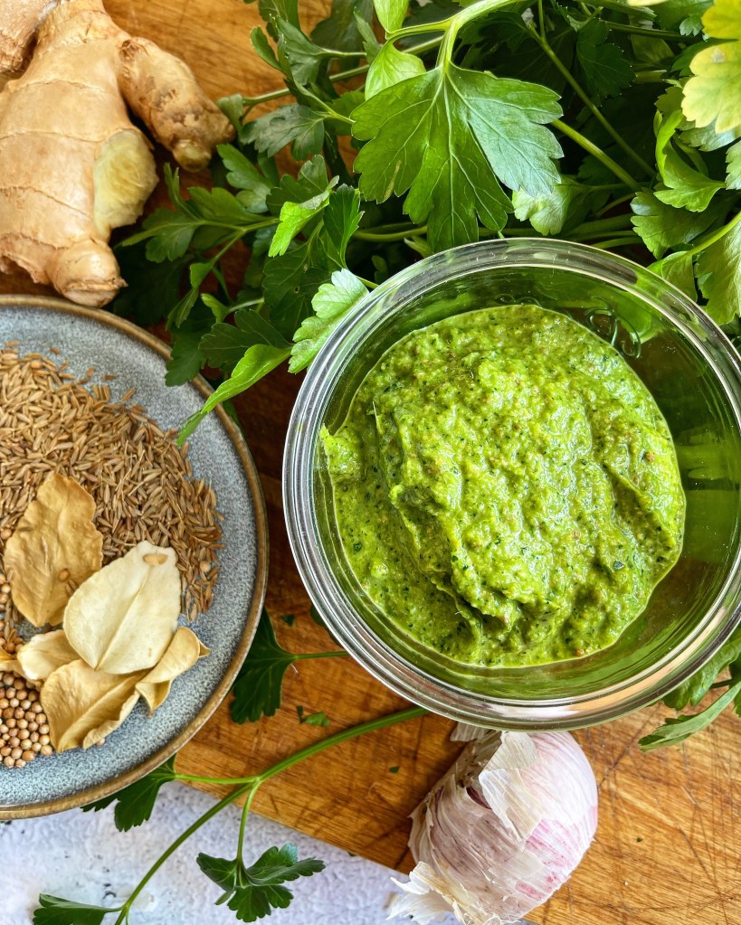 Achtung! Jetzt müsst ihr wirklich gut aufpassen. Für die Paste nehmt ihr alle oben genannten Zutaten, reinigt diese, schneidet sie grob zusammen und püriert sie. That’s it. Füllt die Paste bis zur Weiterverarbeitung in ein Glas ab.