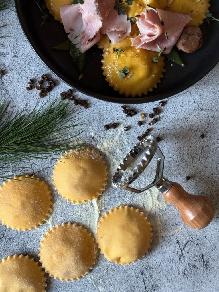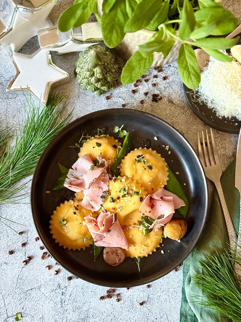 - Birnen-Ravioli mit Kürbiskernschinken und Buttermilchschaum – herbstliche Pasta mit österreichischem Twist