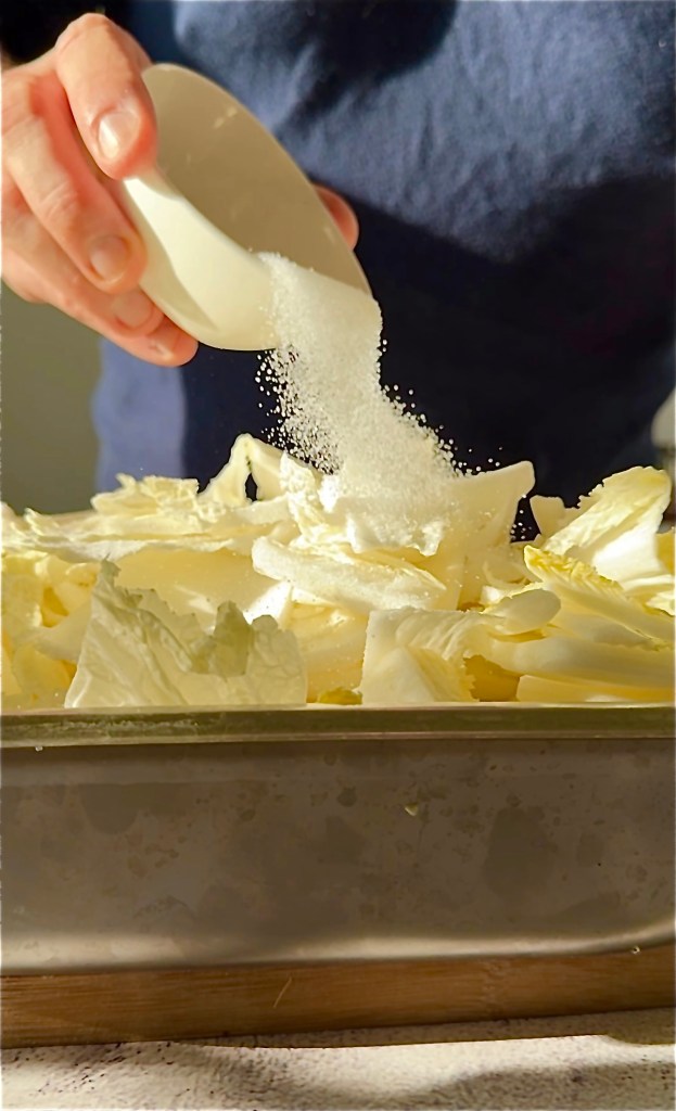 Wichtig für die Fermentation ist der Salzgehalt. Eine Faustregel besagt, dass etwa 2% der Kohlmenge an Salz zugeführt werden sollen. Also bei 1000g Kohl sind es 20g Salz. Dieses wird mit den Händen gut in den geschnittenen Kohl massiert und anschließend für gut 2 Stunden ruhen gelassen.