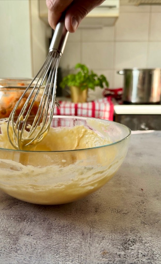 In einer Schüssel vermengt ihr nun Eier und Mehl. Wollt ihr es full-on asiatisch machen, nehmt ihr Essstäbchen zum Rühren. Um den Teig aber schön glatt zu bekommen, verwendet ihr am besten einen Schneebesen. 100 ml Milch machen den Teig geschmeidiger.