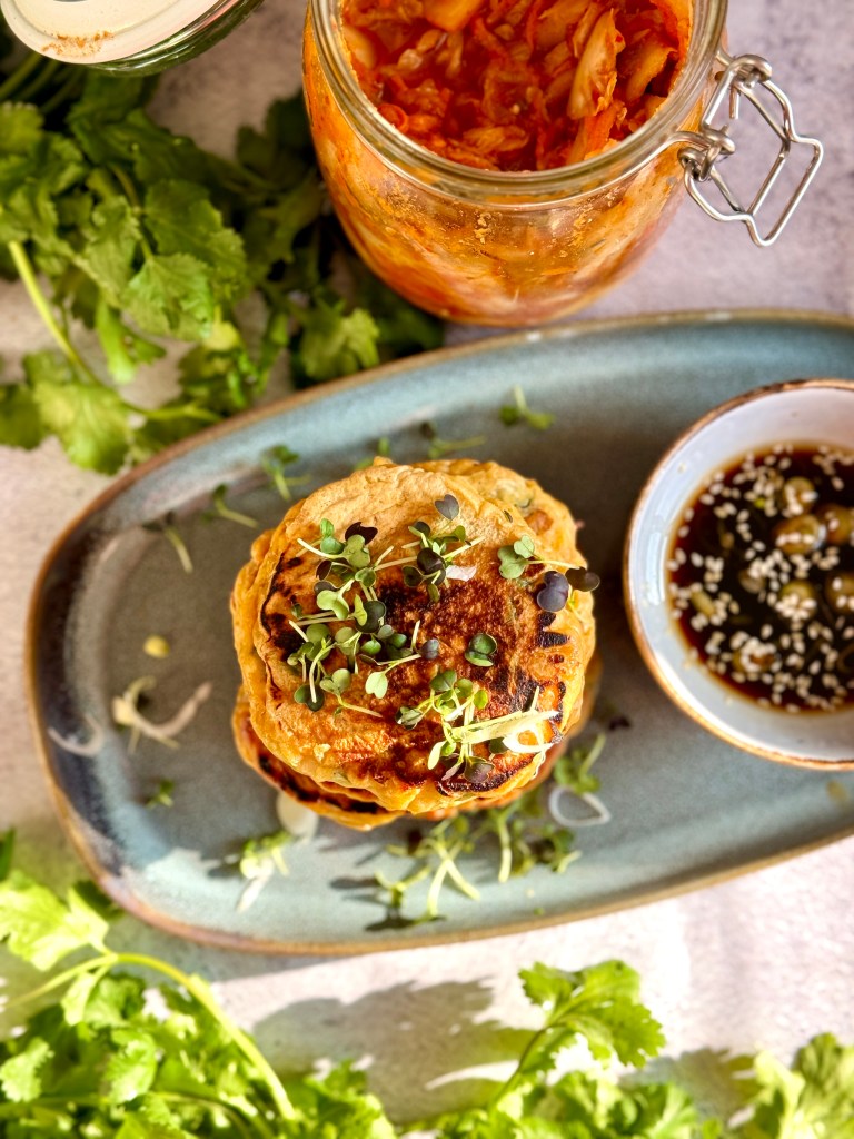 Für Zweiteres vermengt ihr die Sojasauce mit dem Sesamöl, Sesamkörner und Frühlingszwiebel. Fertig! Und schon könnt ihr die leckeren Kimchi Pancakes genießen.