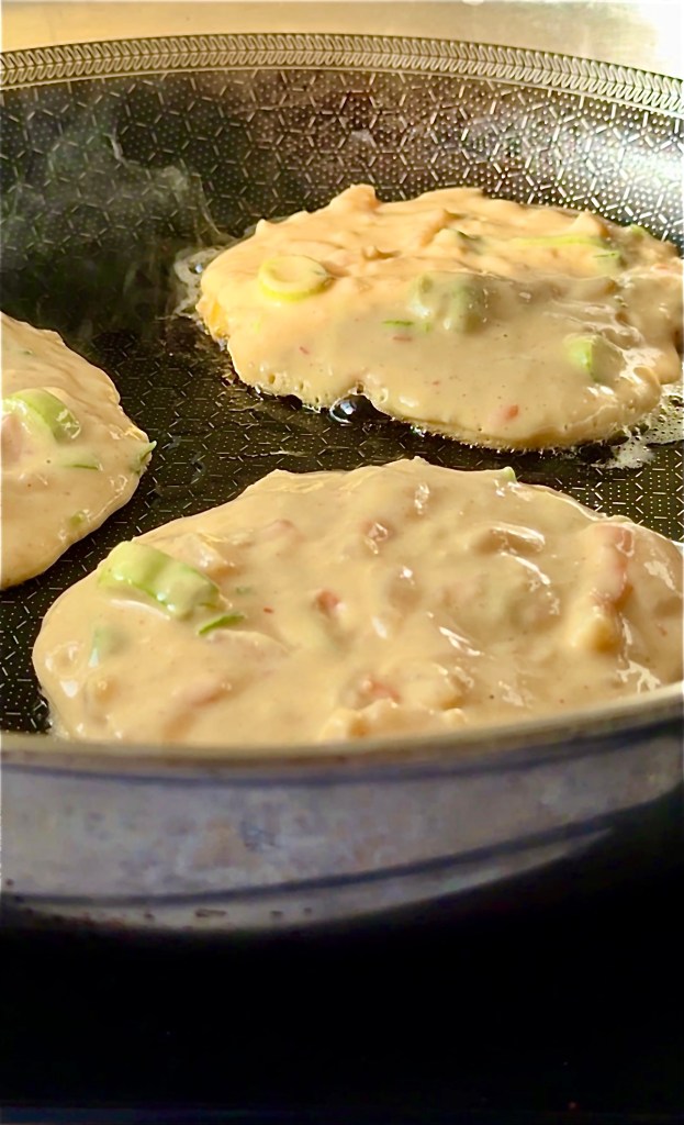 Eine Pfanne erhitzen und je 3 Pancakes in etwas Sesamölund Butter goldbraun rausbacken. Vorsicht! Die Pfanne darf nicht zu heiss werden, sonst werden euch die Kimchijeon zu dunkel. Sie sollen langsam aufgehen und fluffig werden.