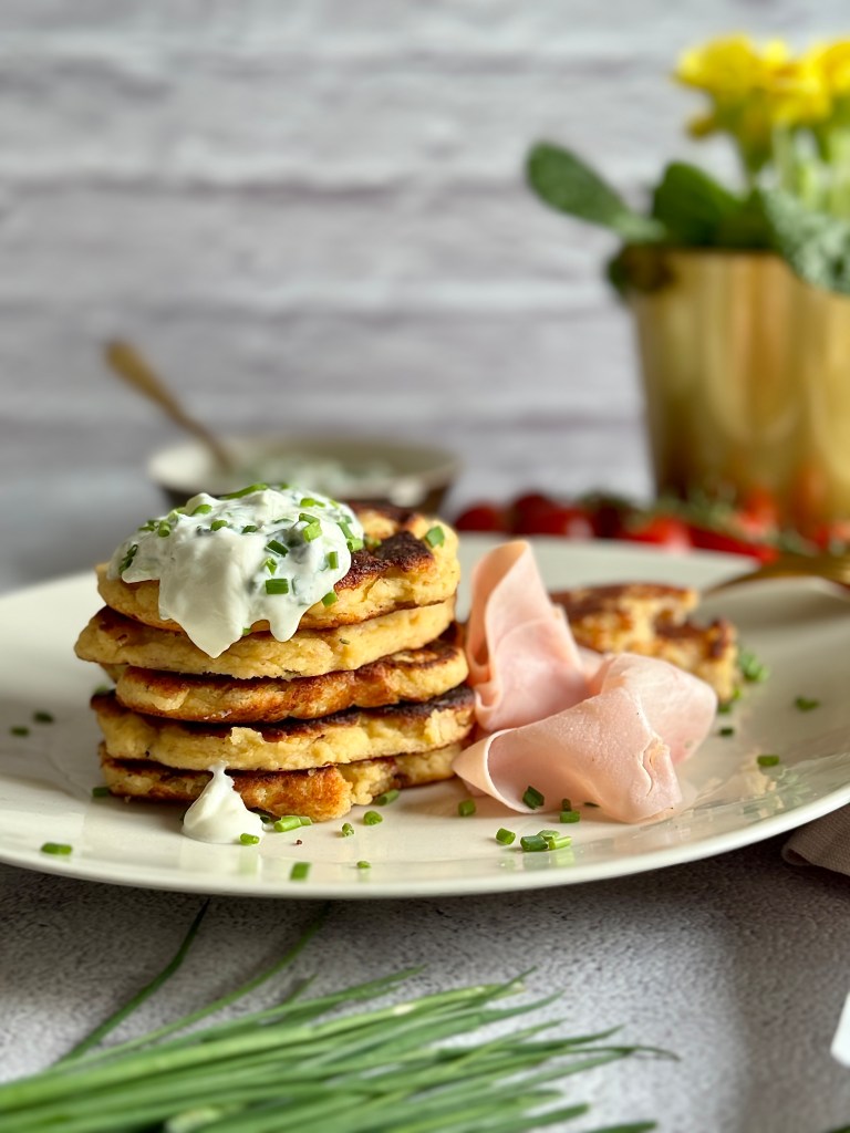Meine herzhaften Pancakes werden mit Mandelmehl zubereitet, wodurch sie nicht nur low carb (= wenig Kohlehydrate), sondern auch glutenfrei sind. (Wisst ihr eigentlich, wie viele Menschen unter einer Glutenunverträglichkeit leiden?) Verziert und ergänzt mit einem köstlichen Schinken.